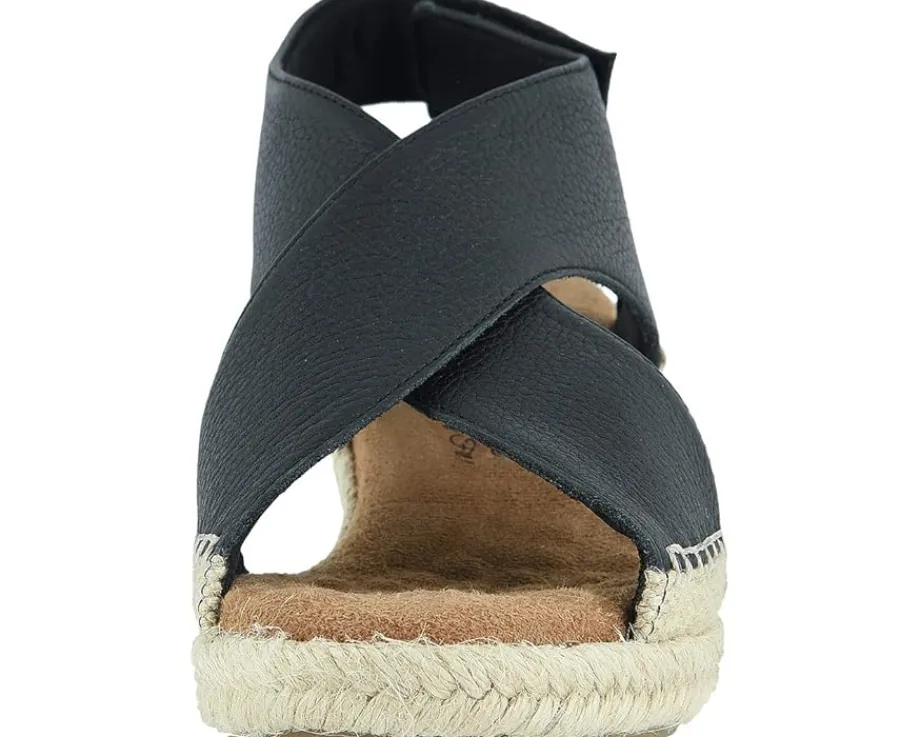 - Crisscrossing straps with an adjustable hook-and-loop fastener at heel.
