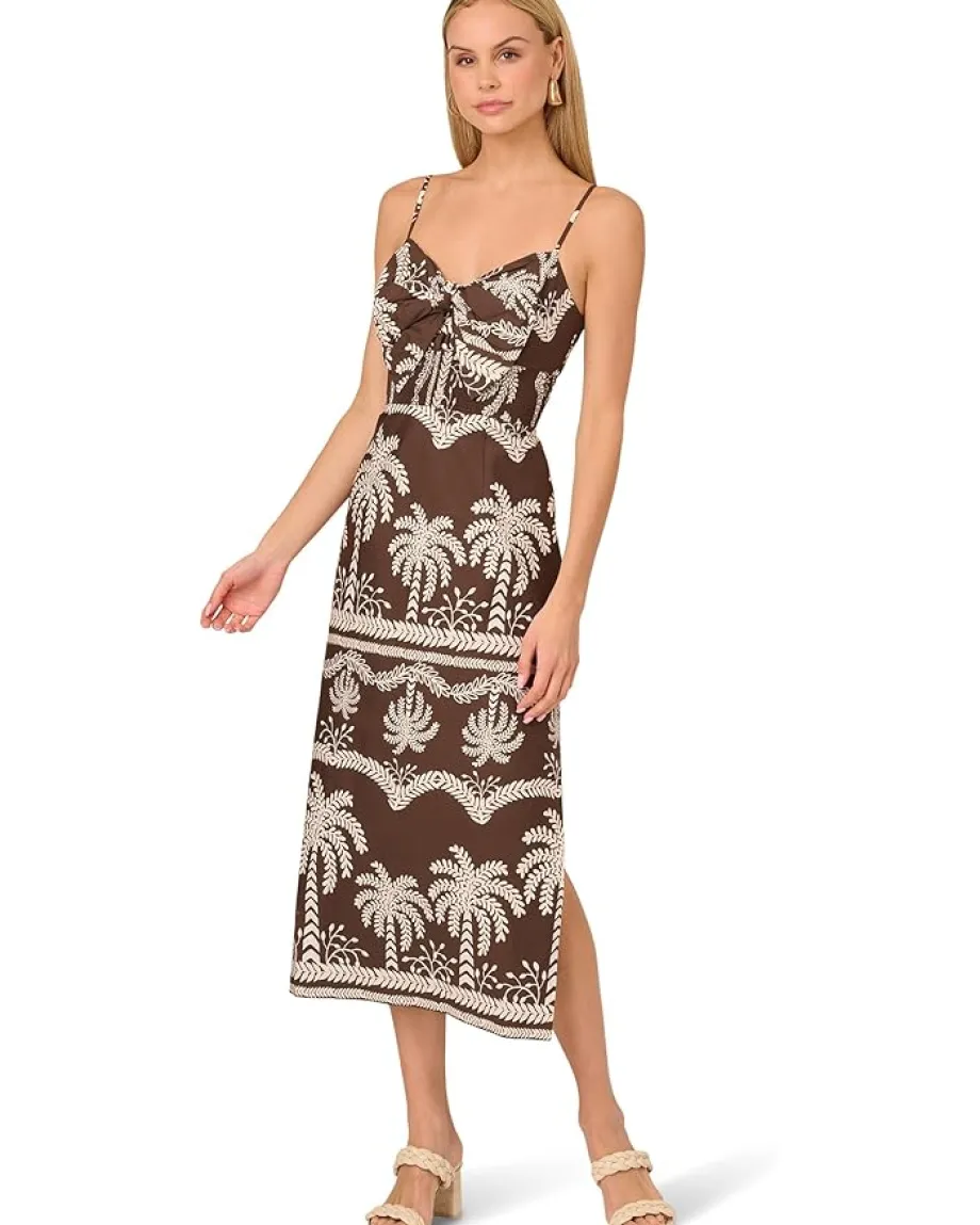 - Ethereal elegance in the Adrianna Papell® Printed Maxi Dress. Featuring a romantic sweetheart neckline and delicate spaghetti straps, this blouson silhouette drapes beautifully, offering a flattering and flowy fit. The vibrant print adds a touch of artistic flair, while the below-the-knee length and side slits create effortless movement with every step. A zippered back closure ensures a seamless fit, making this dress perfect for sunlit soirees, breezy getaways, or elegant evenings.