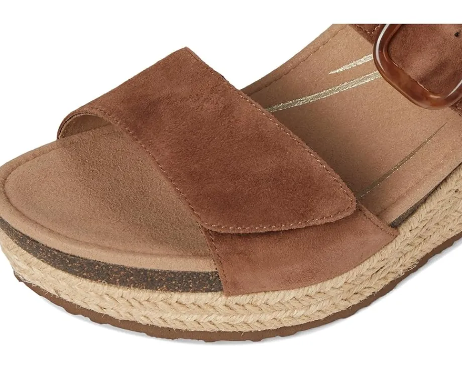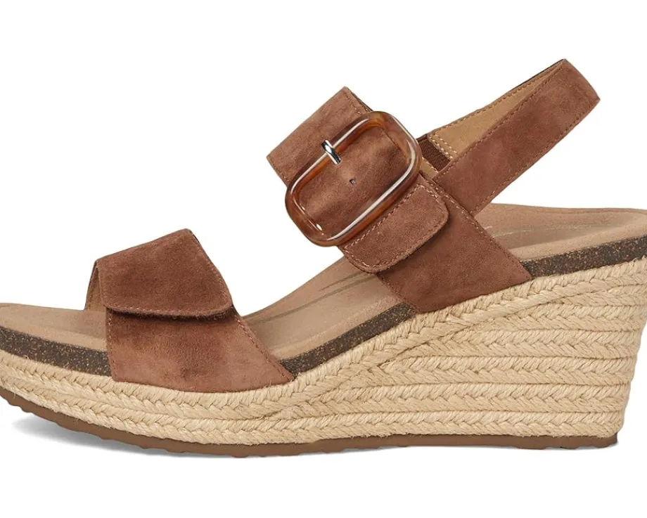 - Crafted from suede upper, the Aetrex® Ashley features wedge heel, open round toe, and arch support that helps to stabilize your body, align your feet and relieve common foot pain. These sandals are super stylish and comfortable. It comes with wide straps, buckled closure, and brand detailing on the footbed.
