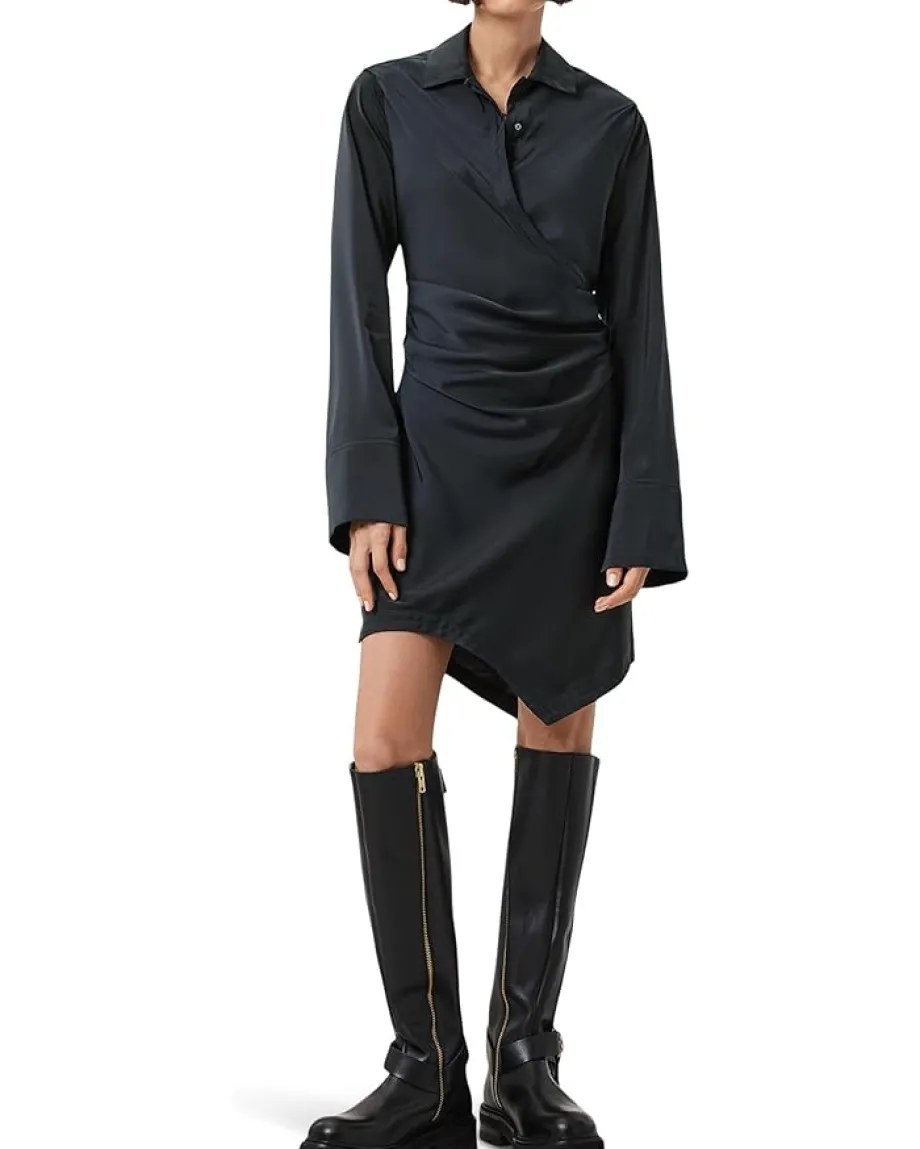- Get ready to turn heads wearing the AllSaints™ Tira Mini Dress. With a chic, relaxed shirt collar, concealed zippered side closure, and elegant long sleeves with wide cuffs and splits, this dress is perfect for any occasion. The wrap silhouette and asymmetrical hem create a unique look that will make you stand out in style.