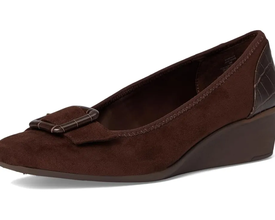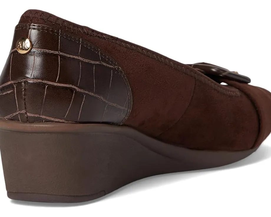 - The Anne Klein® Wyatt is a refined staple that features a squared toe and a suede upper, elevated by a patent-texture heel counter. The padded polyurethane insole ensures all-day wearability, while the rubber traction outsole provides stability with every step. Set on a sleek wedge heel, this versatile pump transitions effortlessly from office to evening.