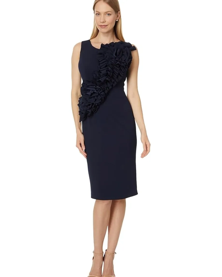 - Ruffle trims laid out in a swanky style, the Betsy & Adam™ Short Scuba Crepe Ruffle Flower Dress offers a statement look. It features a scoop neckline, sleeveless construction, V-back detail, and sheath silhouette.