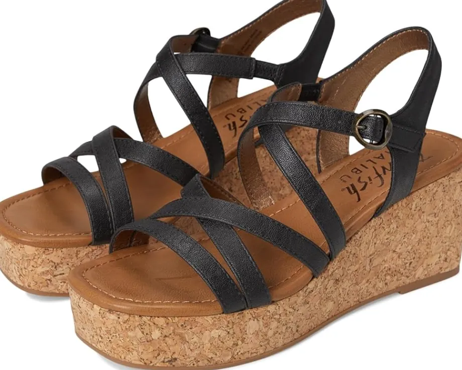 - Update your footwear collection by adding to it the stunning Blowfish® Malibu Aurora Heels. The strappy sandals feature a faux leather upper with a metal buckle closure, polyurethane lining, and a foam insole for lasting comfort. The cork wedge wrap heel adds to the style.
