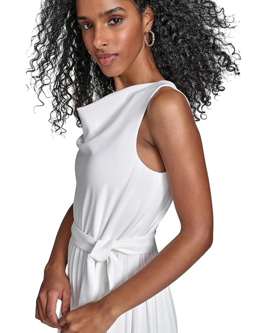 - Take your fashion game to the next level wearing Calvin Klein® Scuba Crepe Pleat Skirt Dress. The sleeveless dress features a cowl neck, tie-up detail at the waist, pleated skirt, and a mid-calf length silhouette.