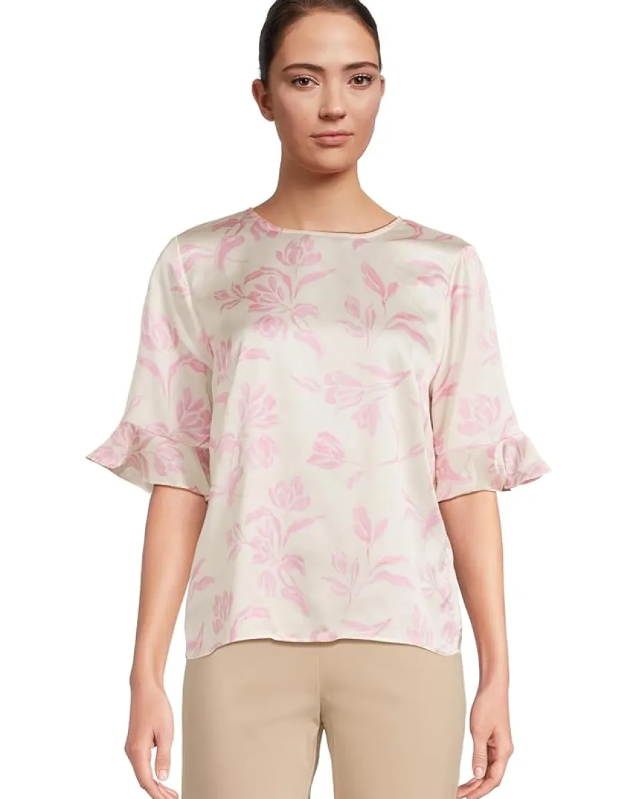 - This delightful top features a vibrant floral print that brings a burst of color and charm to your look. The 3/4 sleeves are adorned with playful ruffle cuffs, adding a touch of feminine elegance to the classic crew neck design.