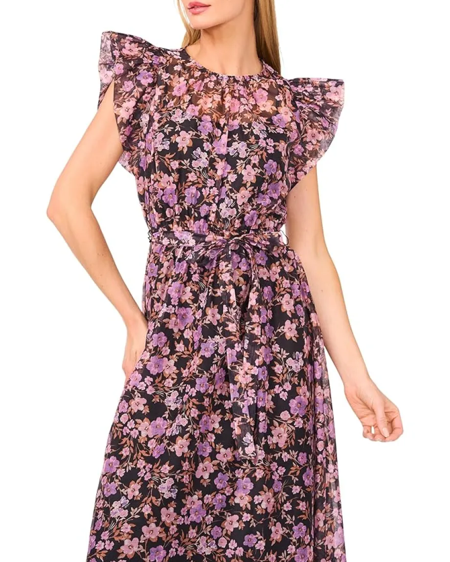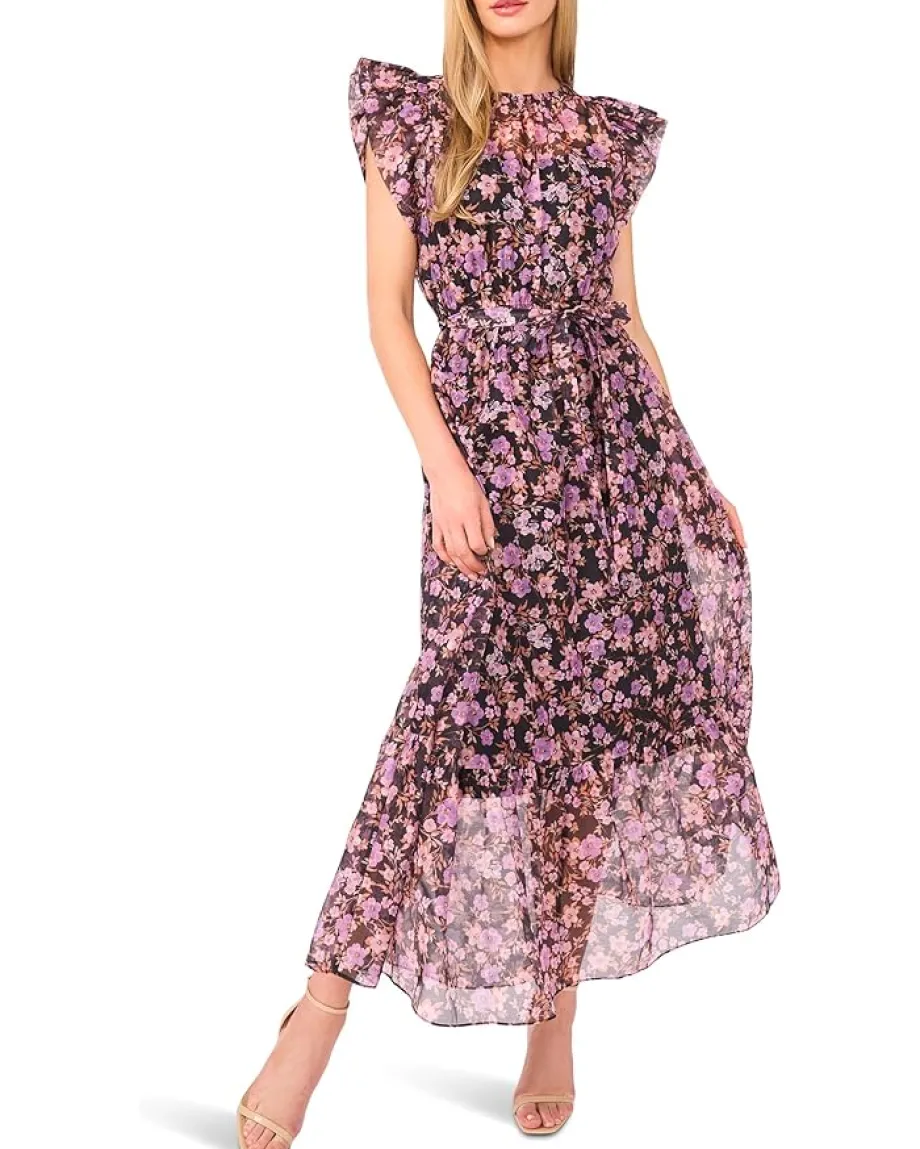 - Float into the moment with ethereal charm styling CeCe™ High Neck Flutter Sleeve Maxi Dress. Crafted from floral soft organza, it delivers a dreamy, romantic feel while offering breathable comfort. The sophisticated high neckline adds timeless elegance, balanced perfectly by flutter sleeves that dance with every step. A flattering tie waist cinches your silhouette, while the A-line maxi length creates graceful movement and flow.