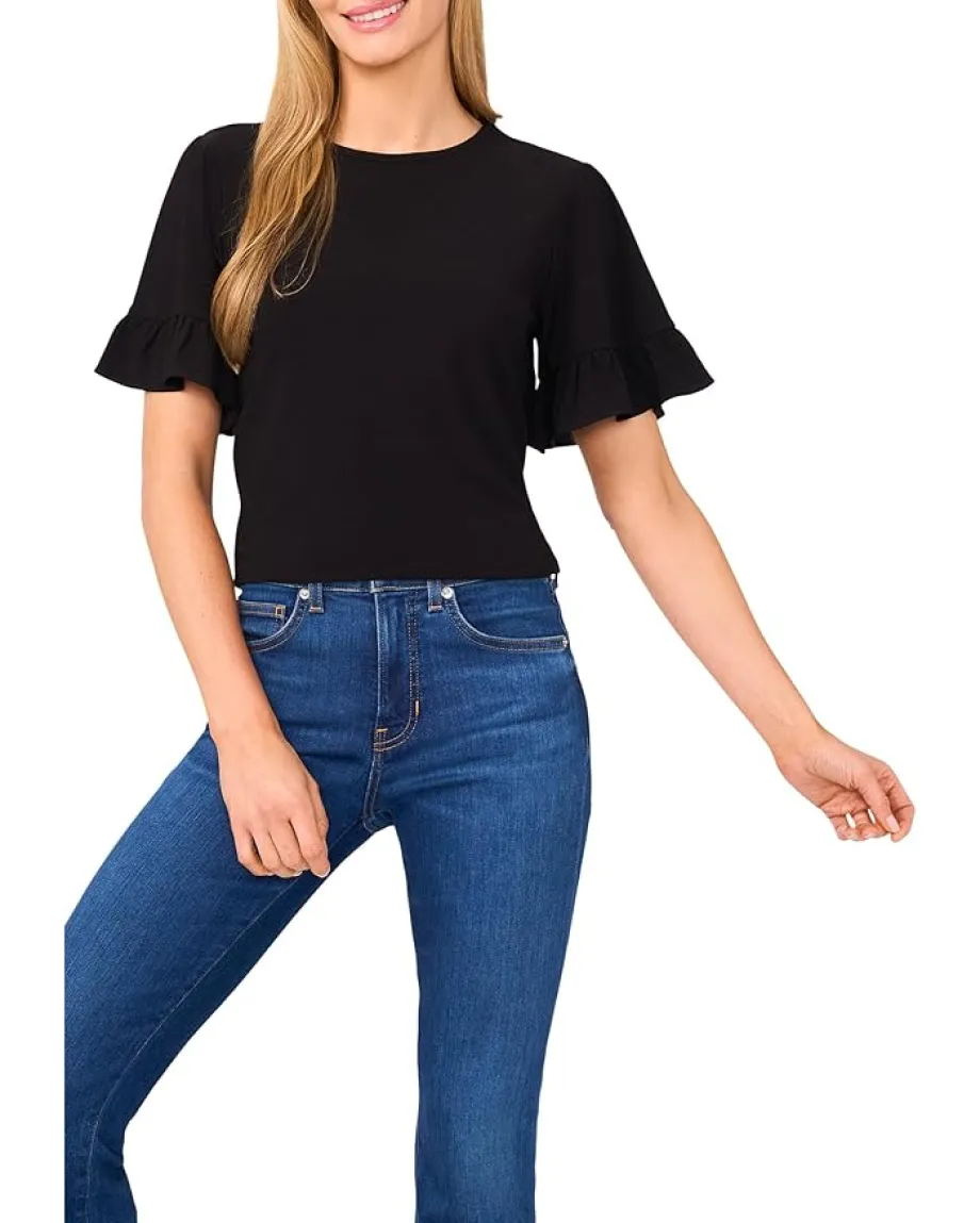 - Soft and feminine, this CeCe™ Short Sleeve Ruffle Detailed Knit Top features delicate ruffle details for a touch of elegance. Perfect for layering or wearing solo, it’s a versatile staple for any season. Designed with short sleeves accented by ruffled trim and a high hemline at the back with matching tiered ruffle details, this pullover style top effortlessly combines charm and comfort for a polished everyday look.