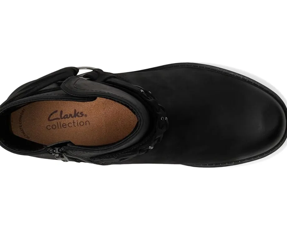 - Showcase your take on legendary style wearing the Clarks™ Hearth Kaylie Ankle Boots. Featuring an interwoven stylish strap at the ankle, the footwear boasts a round toe shape and stacked block heel.