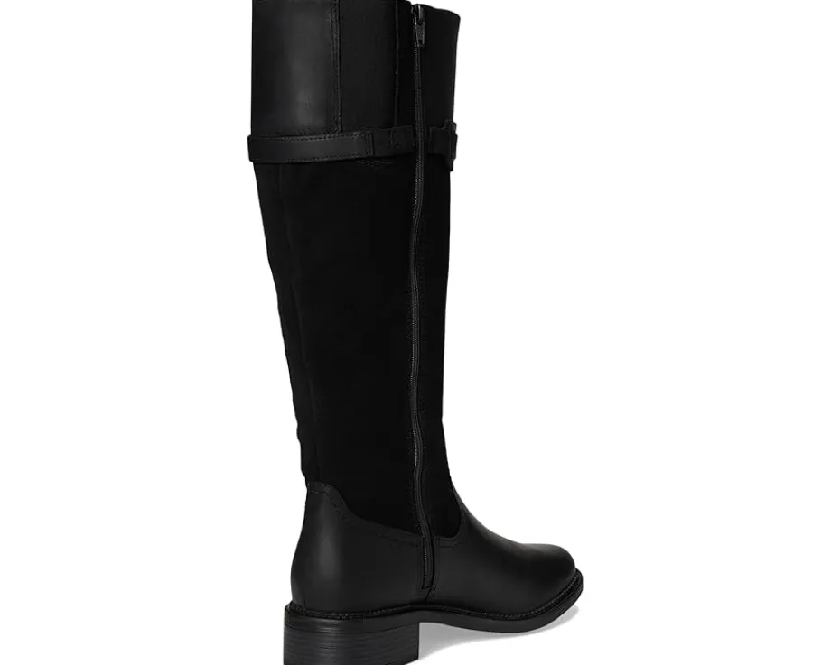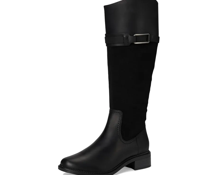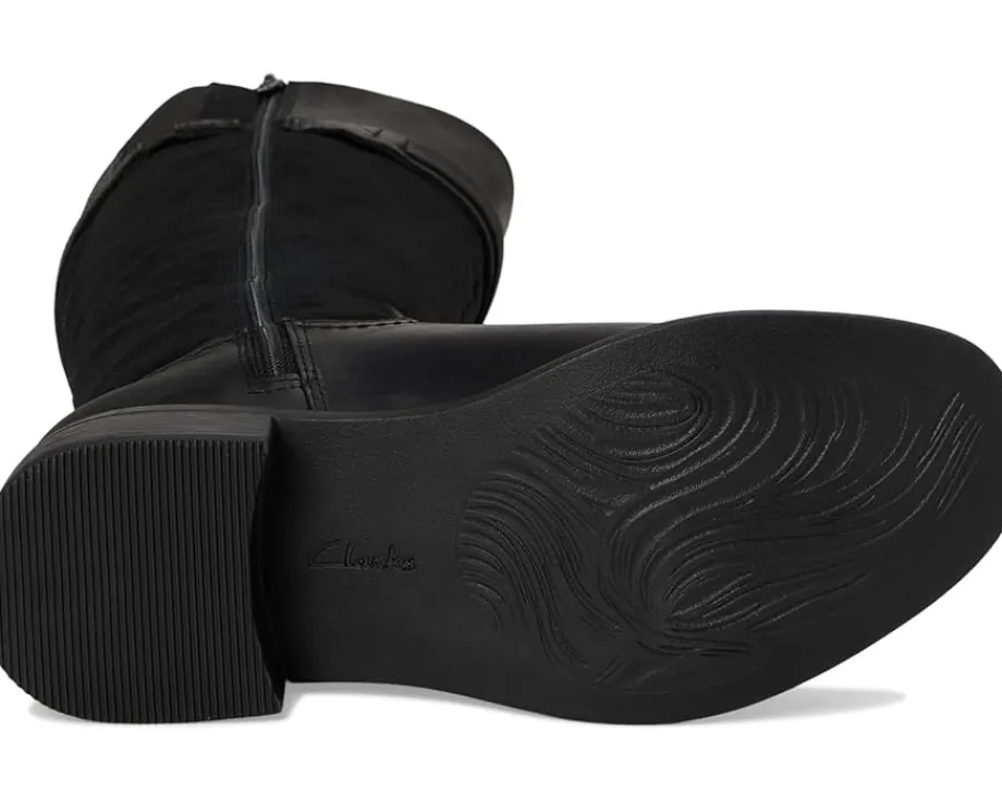 - Add an eye-catching appeal to your outfits with the Clarks™ Maye Carly boots. The polyester insole and mesh lining of these boots keep your feet cool and comfortable. These knee-high boots are made of a leather upper that features a zippered side closure and a buckle detail. Stylish and durable, these hiking boots make a great addition to your footwear collection.