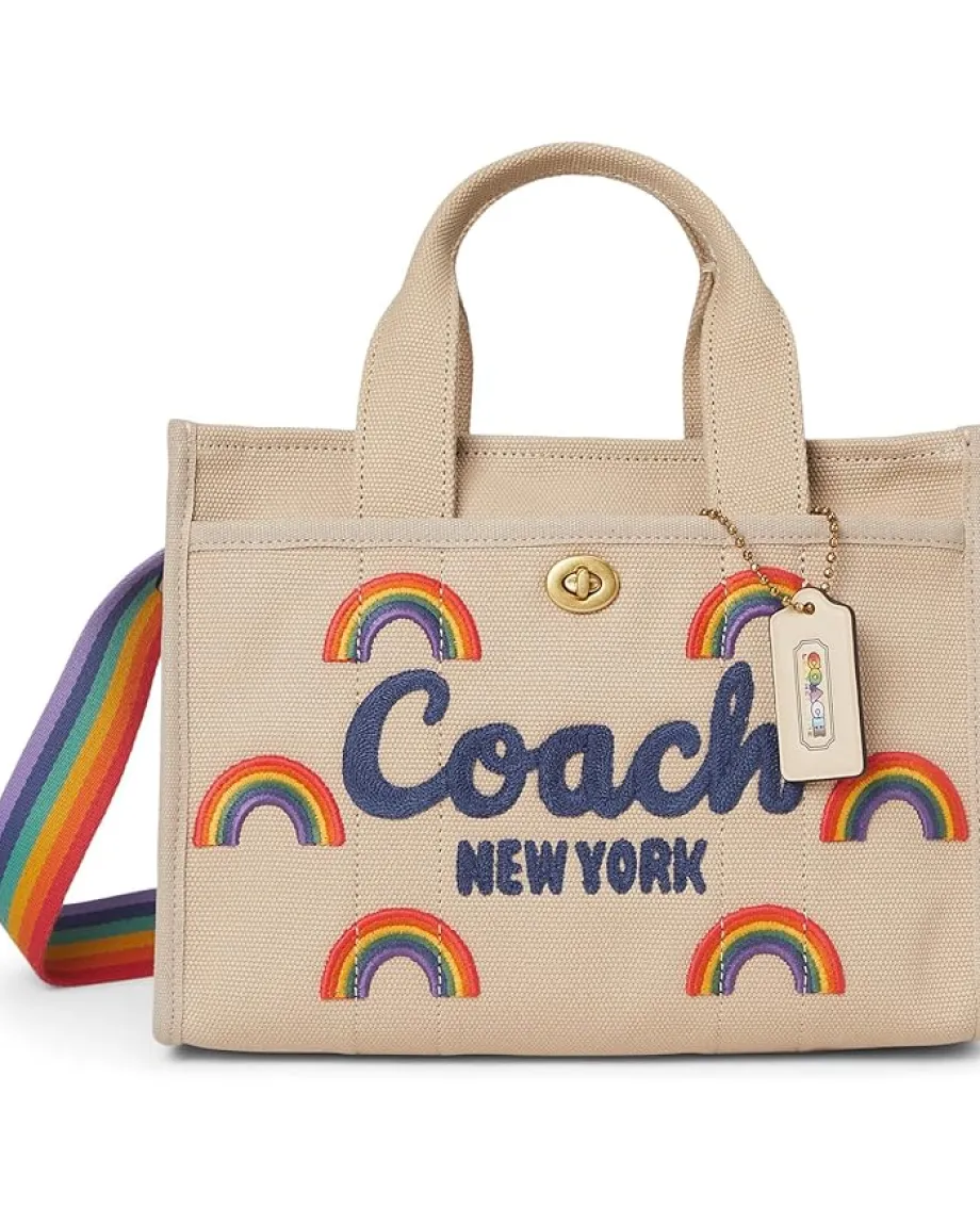 - Exude pretty vibes while keeping your little essentials stored in the COACH™ Cargo Tote Bag 26 With Rainbow. Crafted with a canvas and grosgrain material and cotton lining, the tote bag features a spacious internal compartment, a zipper closure on the top, outside turnlock, and snap pockets for hassle-free storage. The detachable strap is designed for easy shoulder or crossbody wear, while the two top grab handles allow you to carry it around conveniently. Plus, the cute rainbow embroidery and Coach branding on the front adds an exquisite look.