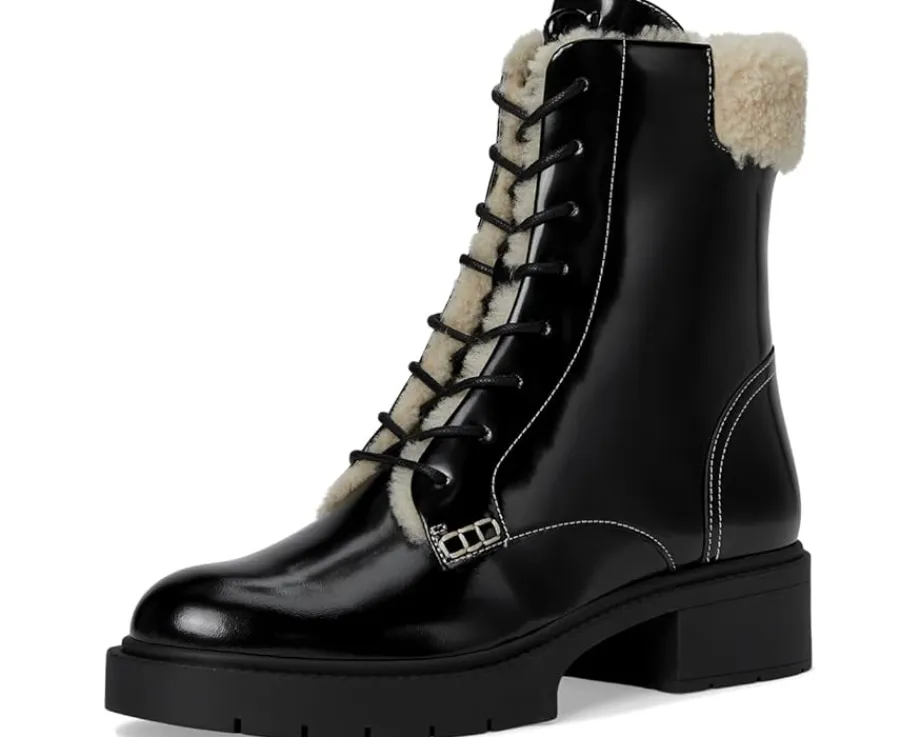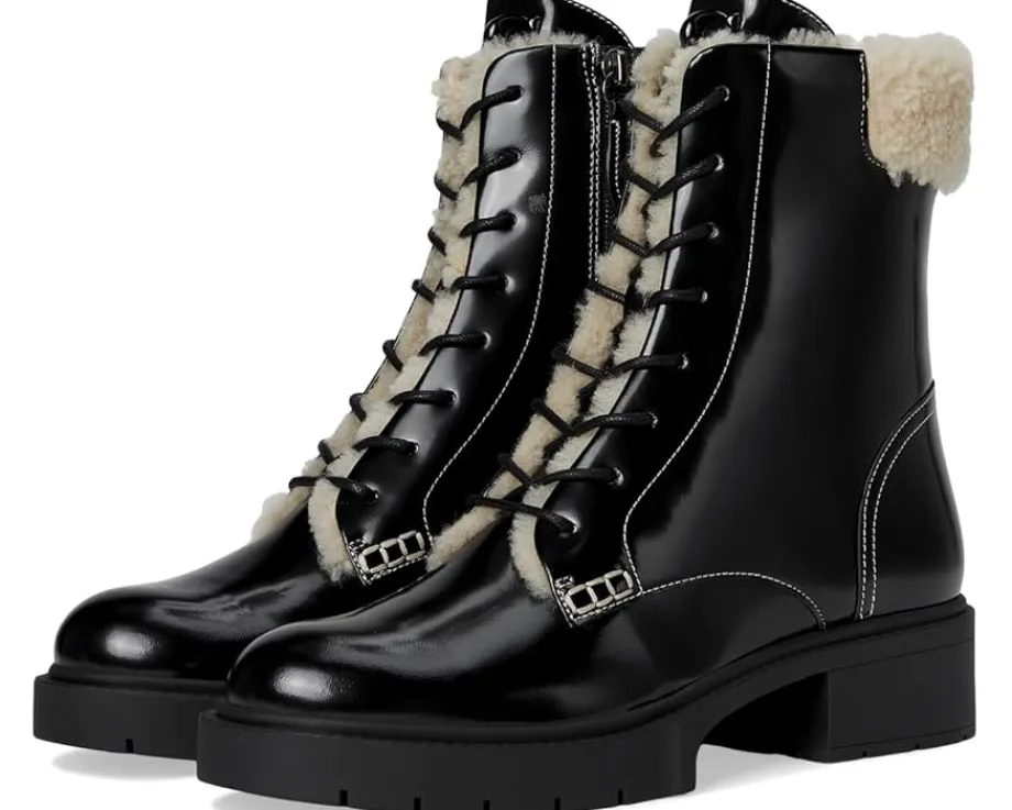 - Maintain your effortless style this chilly weather season in the COACH® Leighton Shearling Bootie. This bootie features a round toe silhouette, leather and shearling upper, man-made leather and shearling lining, and a man-made leather insole.