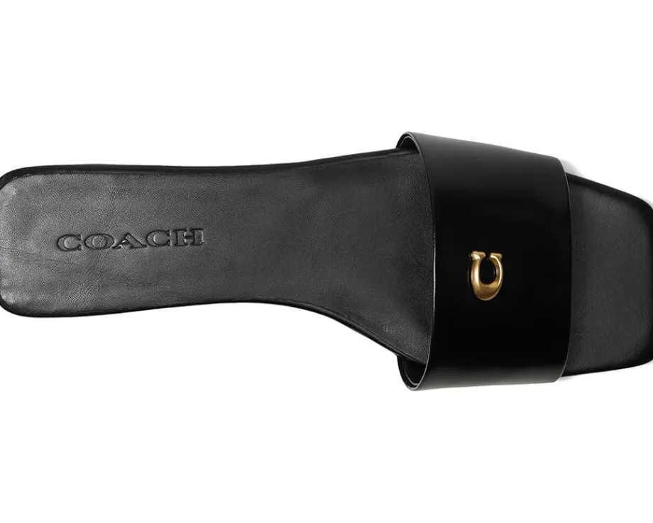- Slide in, step out, and feel the freedom wearing the COACH® Sculpted C Sandals. Crafted from leather upper, man-made leather lining, and rubber insole, this pair of slip-on’s features open square toe, wide strap detailing with brand hardware logo, low-top silhouette, low stacked heel, and brand detailing on the footbed.