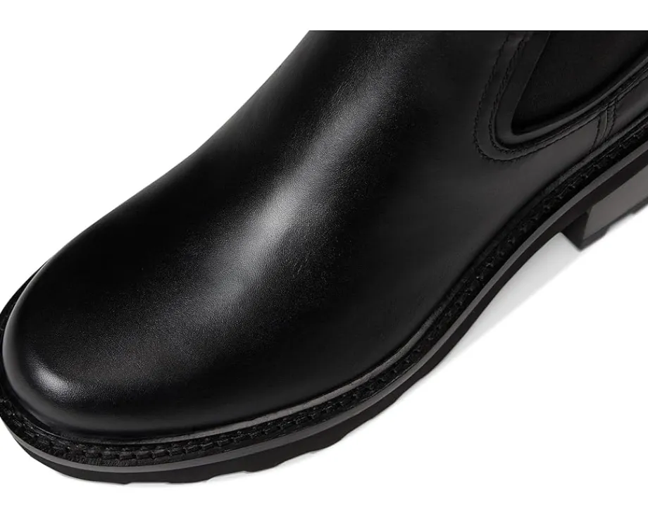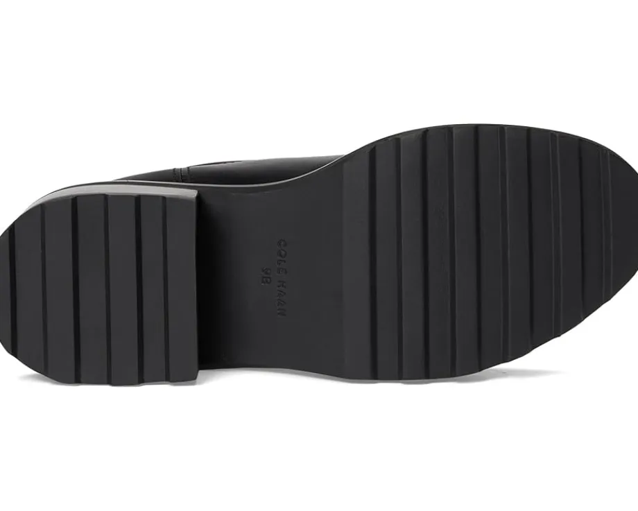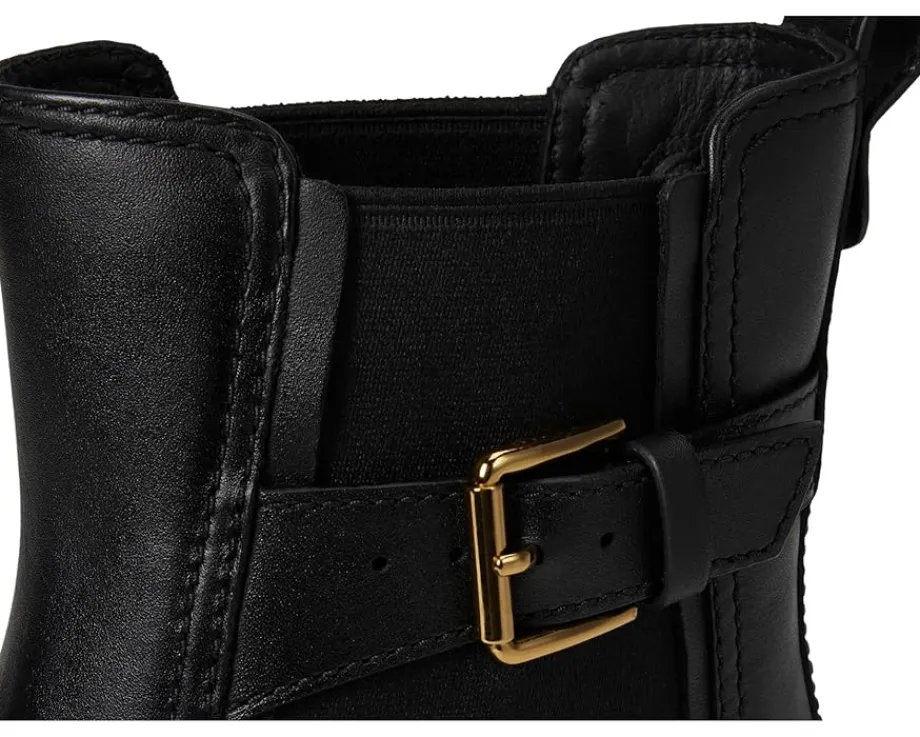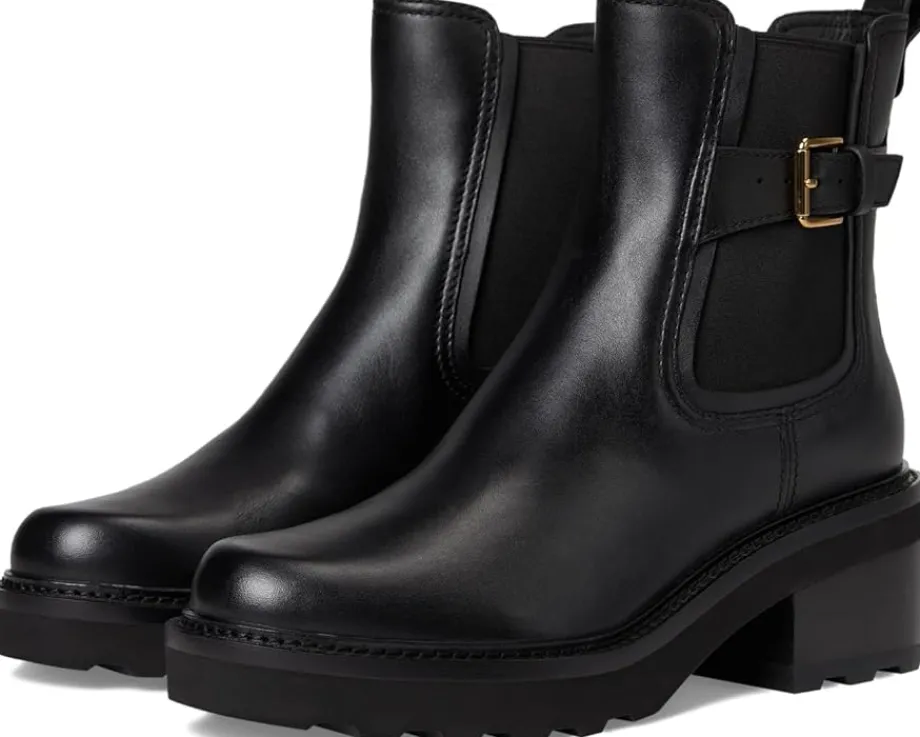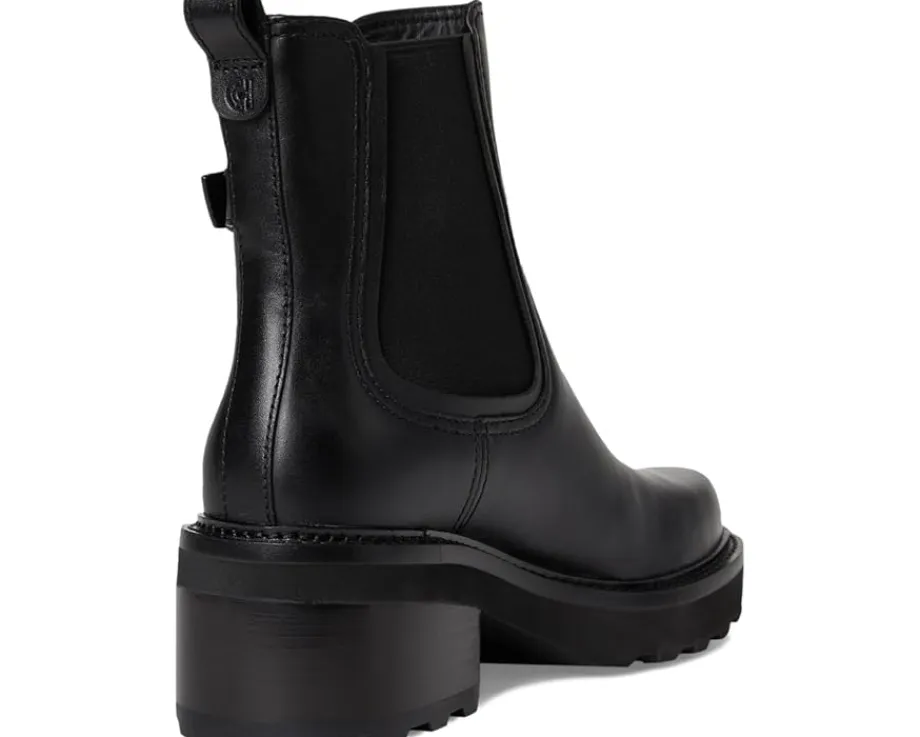 - The Cole Haan® Shibley Waterproof Lug Buckle Boot features a waterproof leather upper for protection against the elements. Inside, a fully padded leather sock lining provides enhanced comfort. The midsole consists of an EVA wedge, measuring 65mm, offering elevated style and cushioning. For stability and durability, the shoe is equipped with a lugged outsole that includes rubber pods for improved traction.