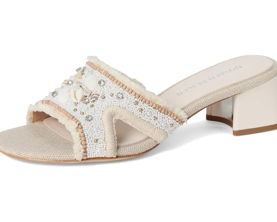 - The Donald Pliner® Kaylan sandals offer a breezy aesthetic with their intricate beaded detailing. These heeled sandals are made of a rubber upper and leather lining. Their slip-on design and memory foam insole ensures effortless comfort, making them a perfect go-to for warm days.