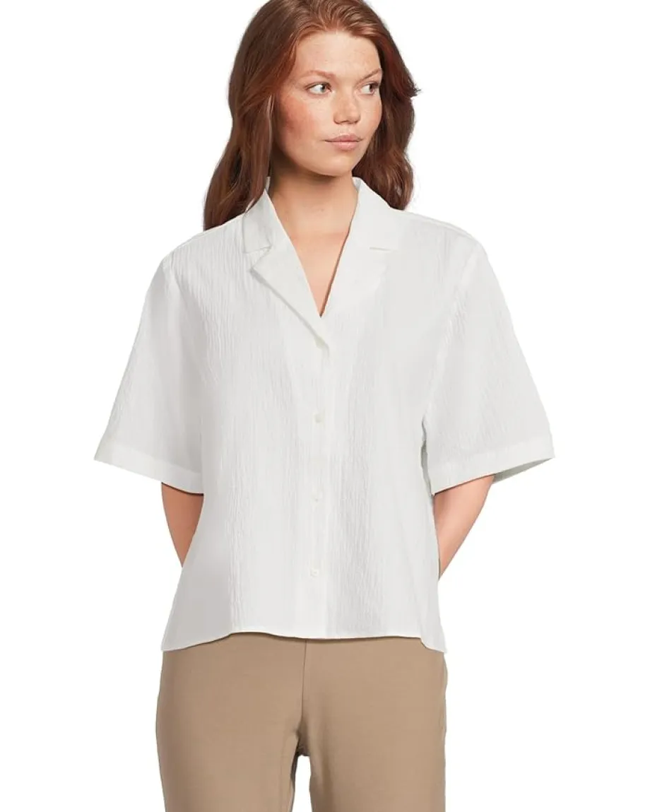 - Look stylish wearing the Eileen Fisher® Notch Collar Shirt. A lightweight weave with the look of seersucker and the softness of organic cotton. It features a collared neckline, short sleeves, and a buttoned front closure. Washed for crinkled texture!