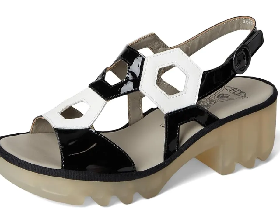 - The FLY LONDON® TEWA573FLY, timeless sandals for endless charm. Crafted from leather upper, polyester lining, and foam insole, this pair of sandals features open round toe, geometric cut outs allover, ankle strap, buckle closure, block heel, and brand detailing on the footbed.