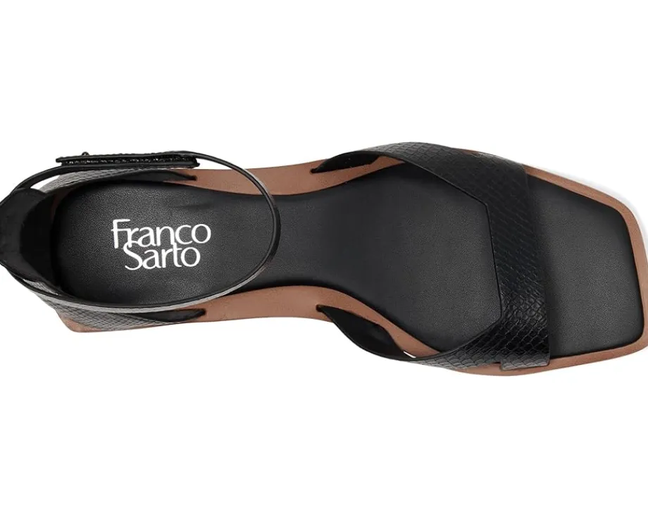 - Your style, simplified wearing Franco Sarto® Elisa. Designed with a sleek faux leather upper and a modern square toe, these sandals are the perfect blend of fashion and function. The slip-on design, complemented by a secure hook-and-loop closure, ensures an easy, adjustable fit. A PU lining and faux leather insole provide all-day comfort, while the synthetic rubber outsole offers durable traction. The eye-catching straps and standout materials make these sandals a statement piece, effortlessly elevating any ensemble.