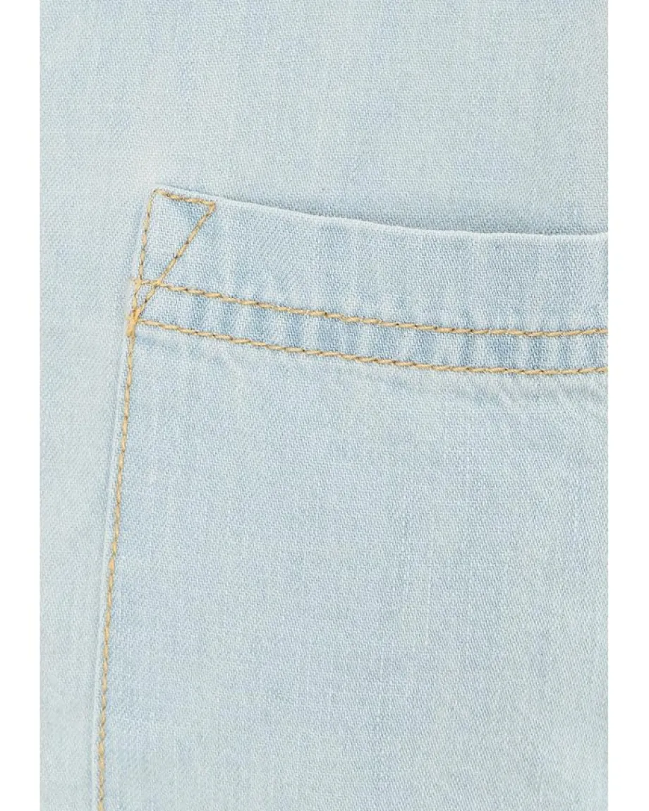 - A classic denim shirt with a little something extra, featuring a ruffled hemline and short balloon-style sleeves. Featuring a collared neckline with a button front, dropped shoulders and a single breast pocket.