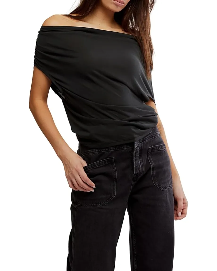 - The Free People™ Blake Knit Top brings together easygoing elegance and trend-forward charm with its relaxed, drapey fit and irresistible slinky jersey fabrication. Designed for those who live for effortless style, this top features a sultry off-the-shoulder neckline that frames the collarbones just right, while delicate ruched detailing adds a touch of playful texture. Draped to perfection, it cascades with a fluid silhouette that flatters every curve, making it the go-to piece for dressing up denim or layering over your favorite bralette.