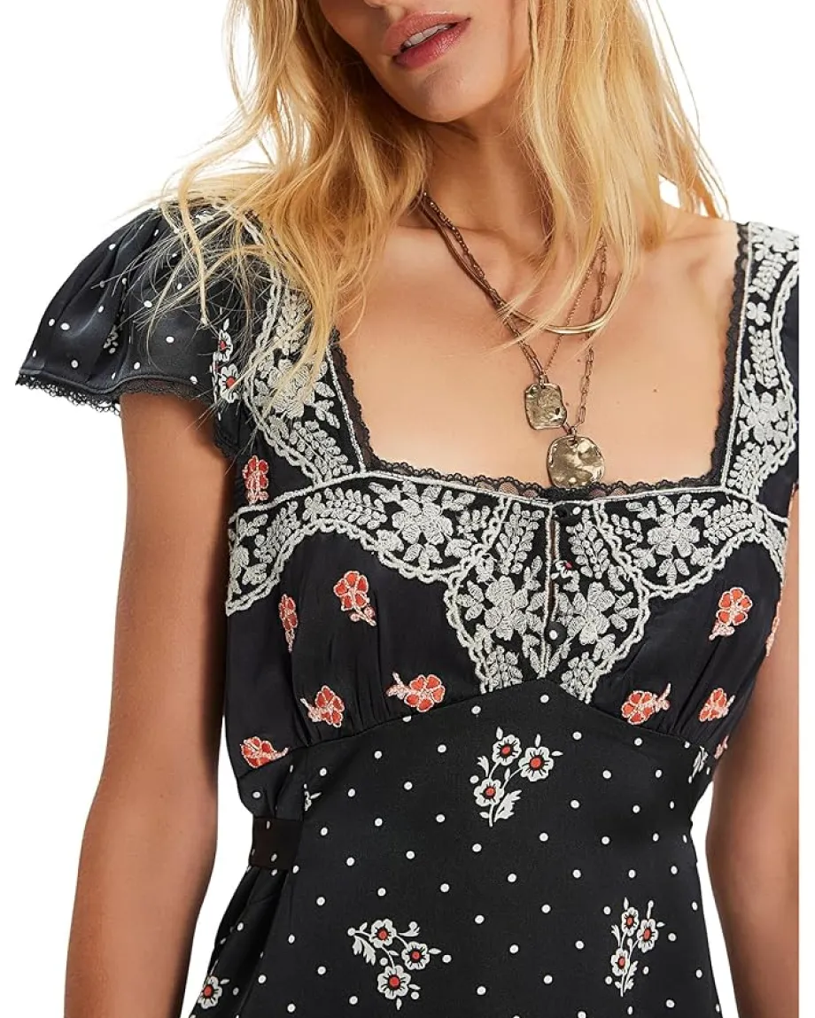 - Slip into this romantic midi dress featuring a satin fabrication with a flowy empire waist, sweet embroidered details, and an adjustable back tie for the perfect fit. Short cap sleeves. Fabric-covered buttons. Lace and ruffle detailing. Plunging back.
