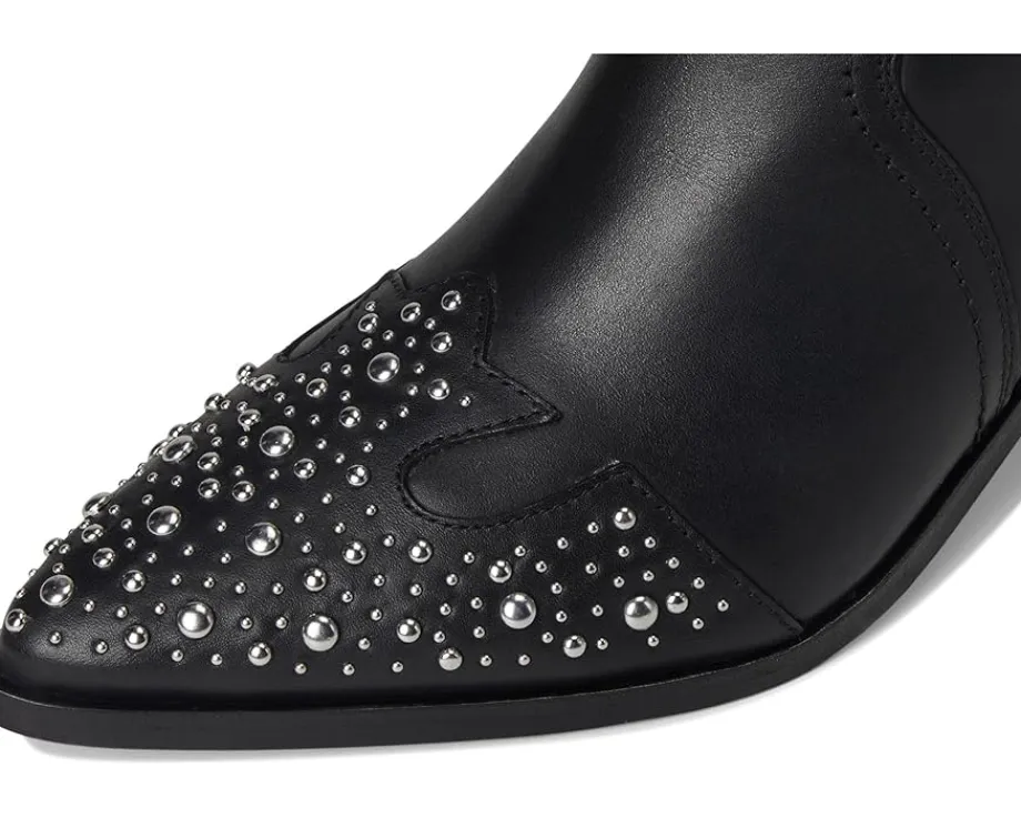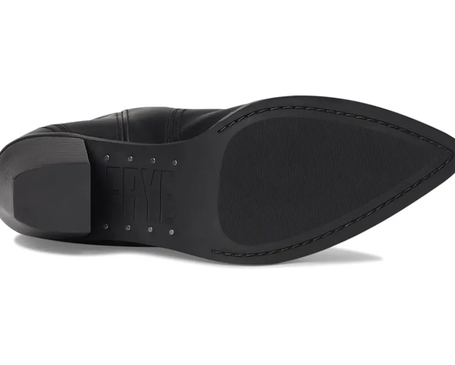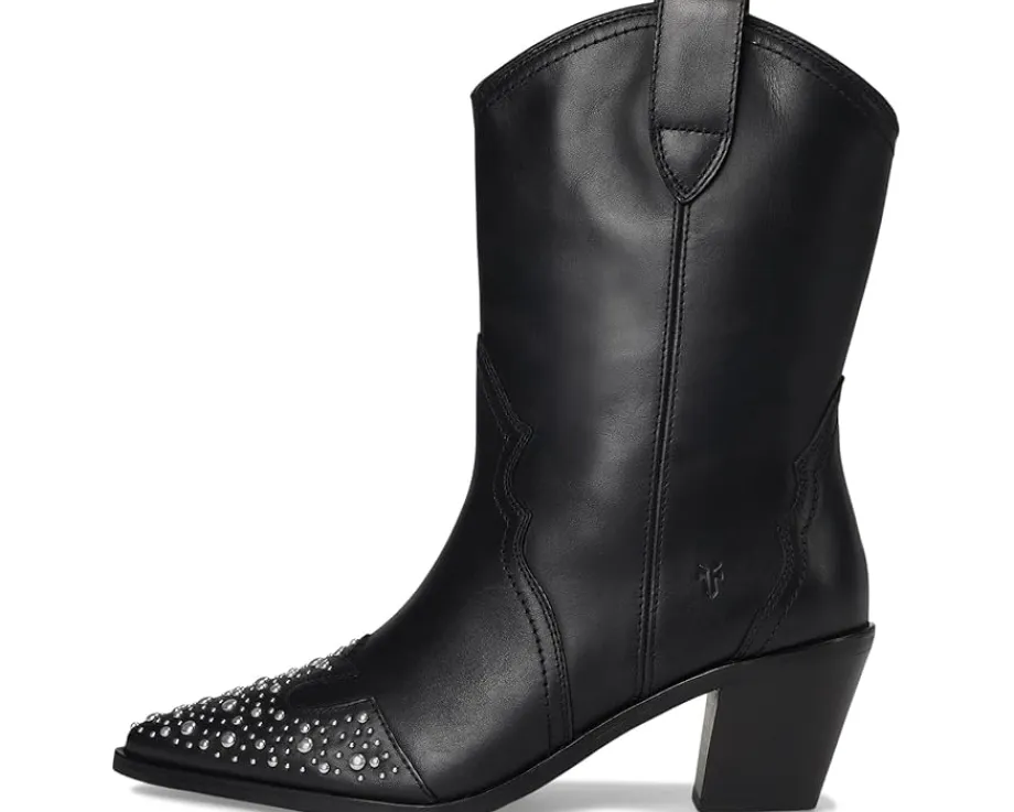 - The Frye® Sara Wingtip Stud ankle boot brings a bold, Western-inspired edge to everyday style. This design features a pointed toe, chunky block heel, and wingtip detailing accented with metal studs, giving it a modern twist on classic cowboy flair. The mid-calf profile makes it easy to pair with everything from denim to flowy skirts.