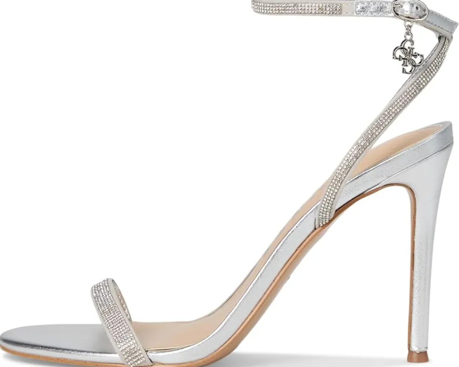 - The final touch of chic, the GUESS® Charmer. Crafted with a durable rubber upper and insole and smooth PU lining and outsole, this stiletto sandal delivers both style and comfort. Its sleek stiletto heel creates a flattering silhouette, while the buckle ankle strap closure ensures a secure, adjustable fit. The open, round toe adds a delicate touch, perfect for showing off a polished pedicure. Accented with a dainty dangling charm, each step exudes feminine elegance and playful movement.