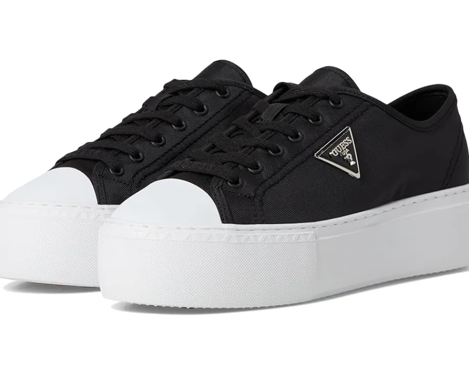 - The GUESS® Joezi shoes give a casual dress-up-or-down appeal. These platform sneakers are accented with a signature Guess triangle logo that is ready to wear with jeans or a dress. They are designed with a cushioned insole, synthetic sock lining, and synthetic rubber lining. The rubber upper features a lace-up closure for a secure fit. These lace-up sneakers are perfect to pair with different outfits and styles.