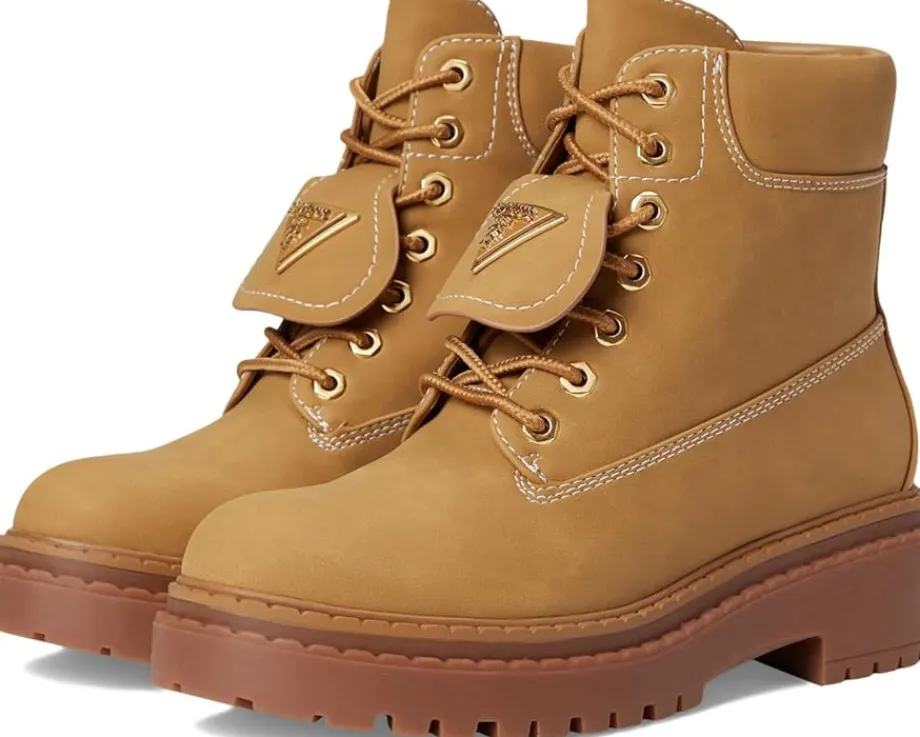 - The GUESS® Leavey boots bring a rugged vibe to a classic Guess combat silhouette. With a trendy chunky rubber outsole, these lace-up boots feature the signature Guess triangle, giving them an elevated casual boot style. They are made of a cushioned insole and synthetic rubber lining. The rubber upper is styled with a flap at the front. These ankle boots are perfect for styling up your looks and outfits.