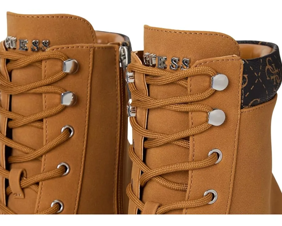 - The Nellsan bootie from Guess® offers a tailored look on a sturdy block high heel. The heeled, lace up combat bootie is a classic look with a modern feel.