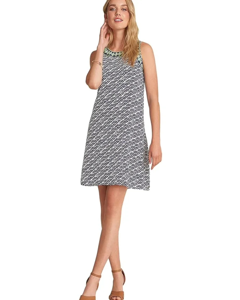 - This Hatley® trapeze-style dress features a round neckline, sleeveless construction, back tie with tassel accents and keyhole design, and allover sun ray print.
