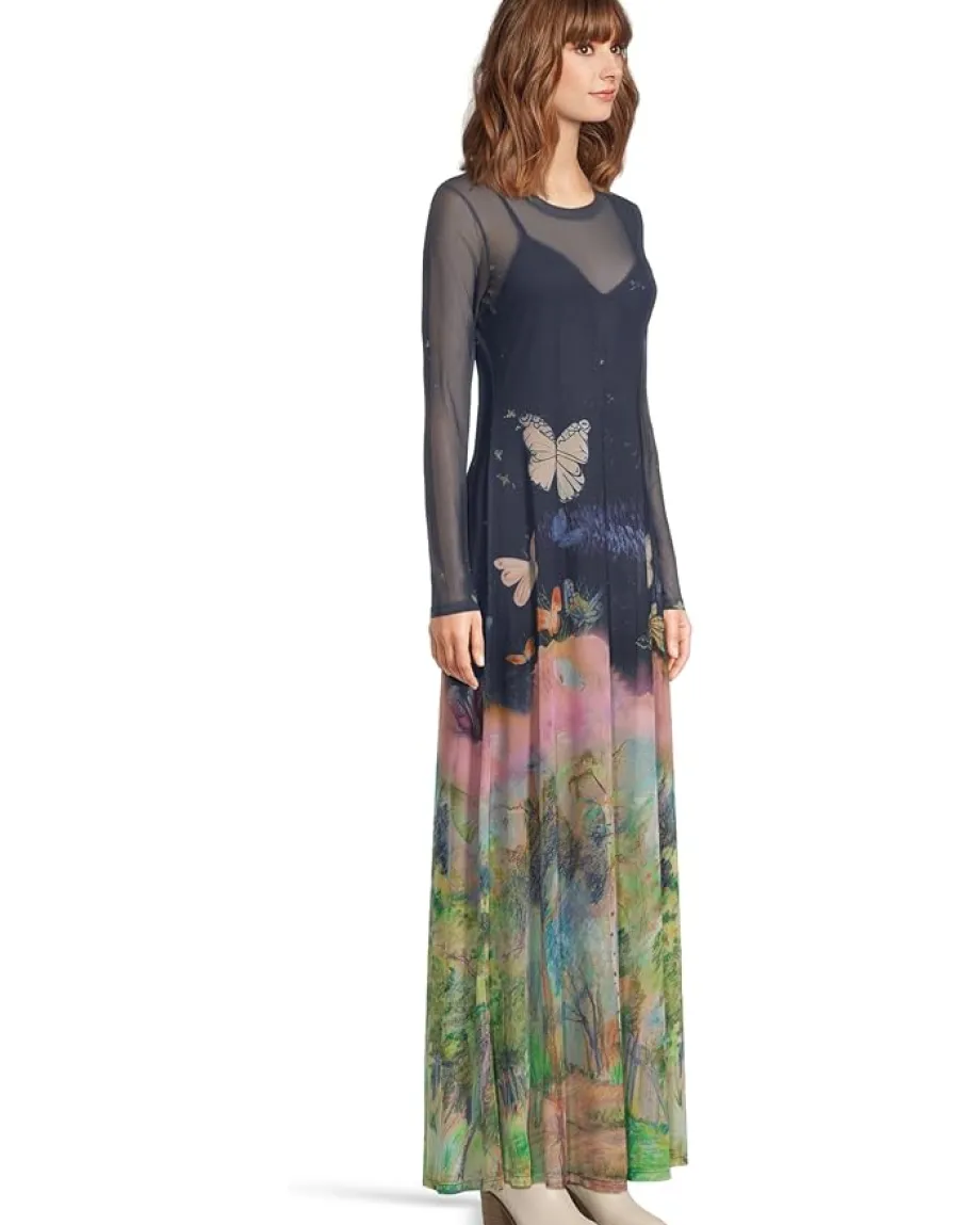 - A sheer, butterfly-kissed maxi dress that’s equal parts dreamy and enchanting. Featuring a crew neckline with long sleeves, straight hem and a pull-on style.
