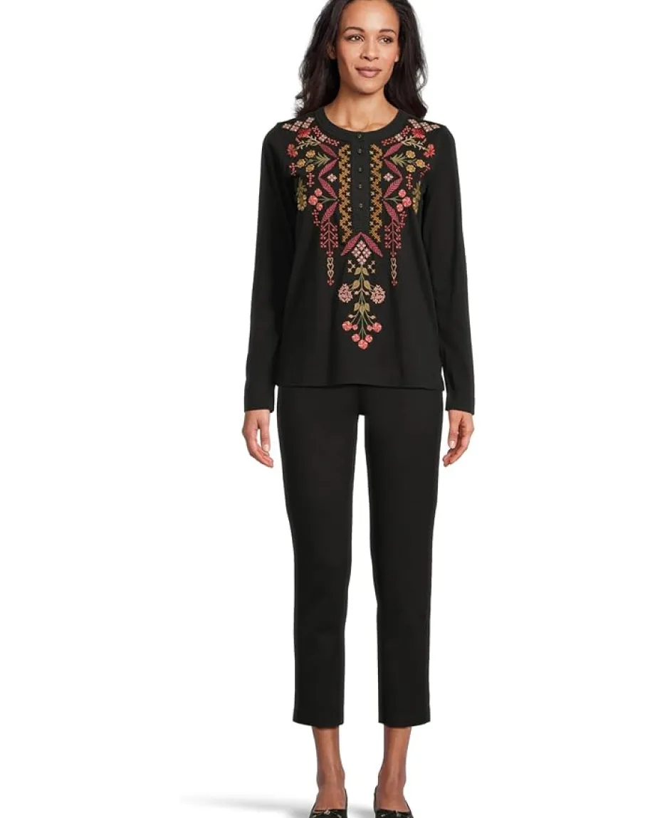- Johnny Was® Mixed Media Henley T-shirt: The always-appealing henley gets a major upgrade in this roomy thermal-knit top with richly-detailed embroidery. It has a crew neckline, long sleeves, and a straight hem.