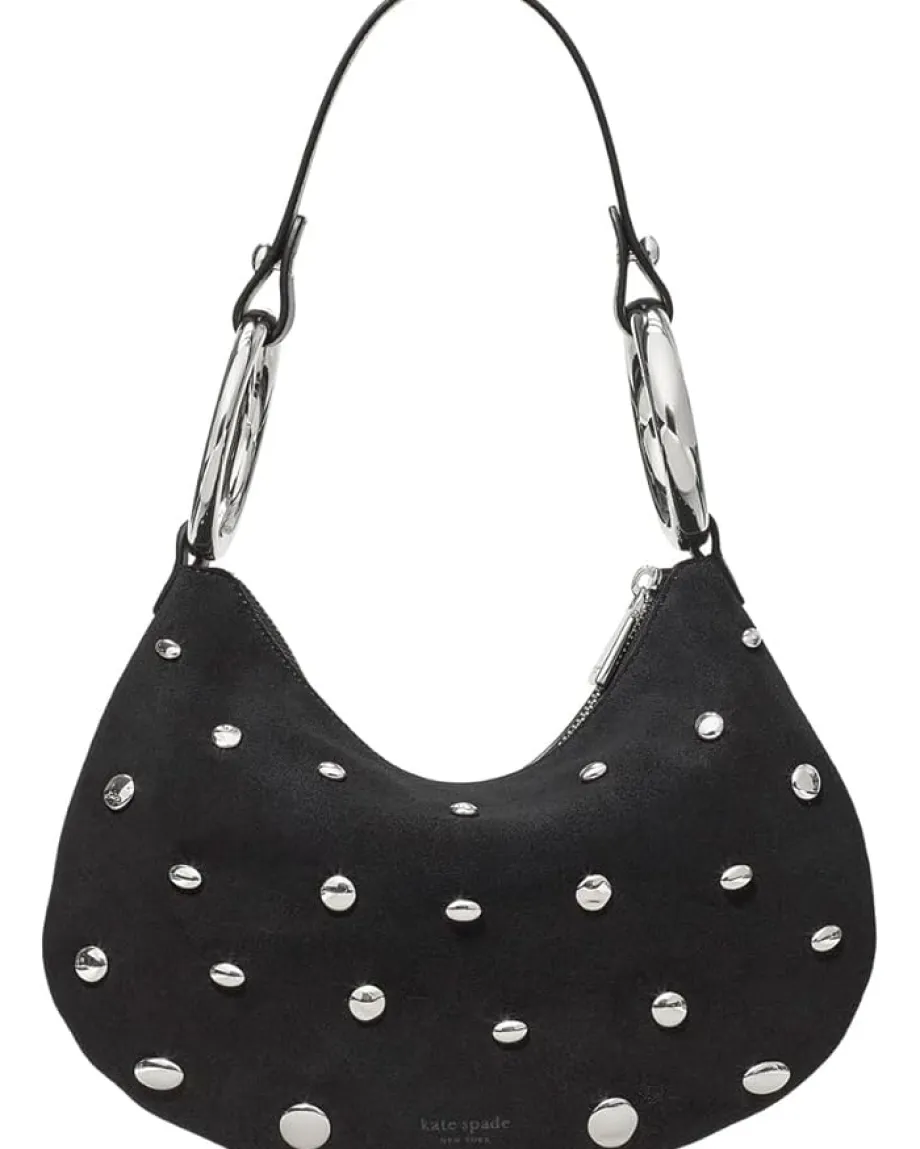- Chic, edgy, and effortlessly glam: Kate Spade New York® The Bangle Studded Suede Bag. Crafted with supple leather and a smooth linen lining, this shoulder bag blends fashion-forward design with everyday practicality. Its roomy single compartment and two pockets keep essentials organized, while the zippered closure ensures everything stays secure. The exterior pops with gold foil “Love” text, perfectly complemented by brushed antique brass hardware, adding a vintage-chic charm to your ensemble.