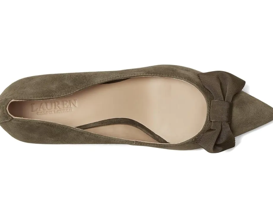 - Lauren Ralph Lauren® Adrienne Bow-Trim Suede Pumps bring sophistication and charm to every stride. Crafted from velvety suede, these pumps feature an ultrafeminine grosgrain bow at the vamp, instantly elevating your look with a touch of romance. The sleek leather upper and lining exude refinement, while the foam-padded insole provides all-day comfort you’ll love. Designed with a graceful kitten heel, these slip-on pumps offer just the right lift for effortless style without sacrificing ease. The durable leather outsole ensures stability and lasting wear, making them a versatile addition to your wardrobe. Finished with the signature “LRL” logo at the back, this pair embodies understated luxury with every detail.