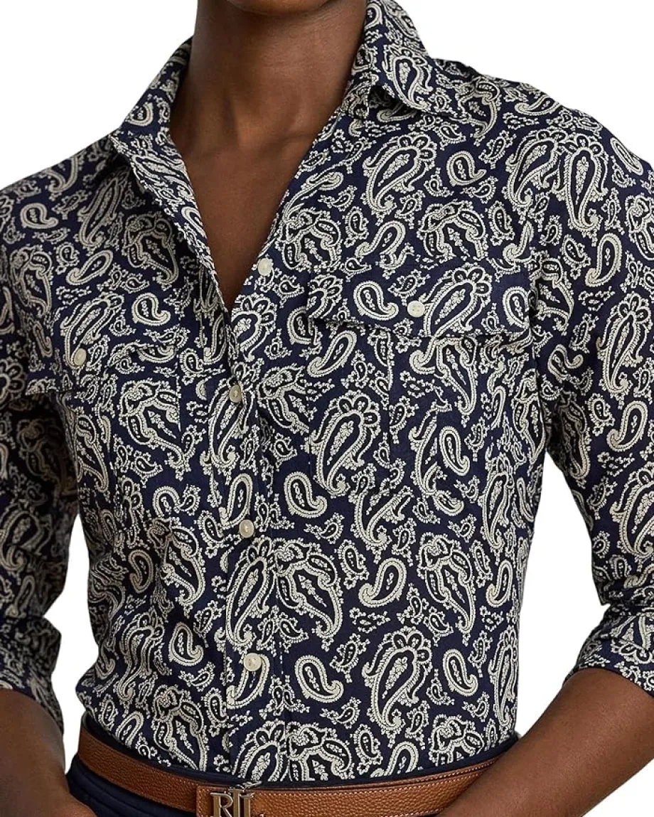 - Crafted with lightweight cotton voile for an airy look and feel, the Lauren Ralph Lauren® Classic Fit Paisley Cotton Voile Shirt depicts an enchanting paisley pattern in hues of blue and cream. It is designed with a buttoned front placket with buttons custom-developed with a “Lauren Ralph Lauren” logo. This patterned shirt is styled with long sleeves, buttoned barrel cuffs, a box-pleated back yoke, a point collar, and a shirttail hem.