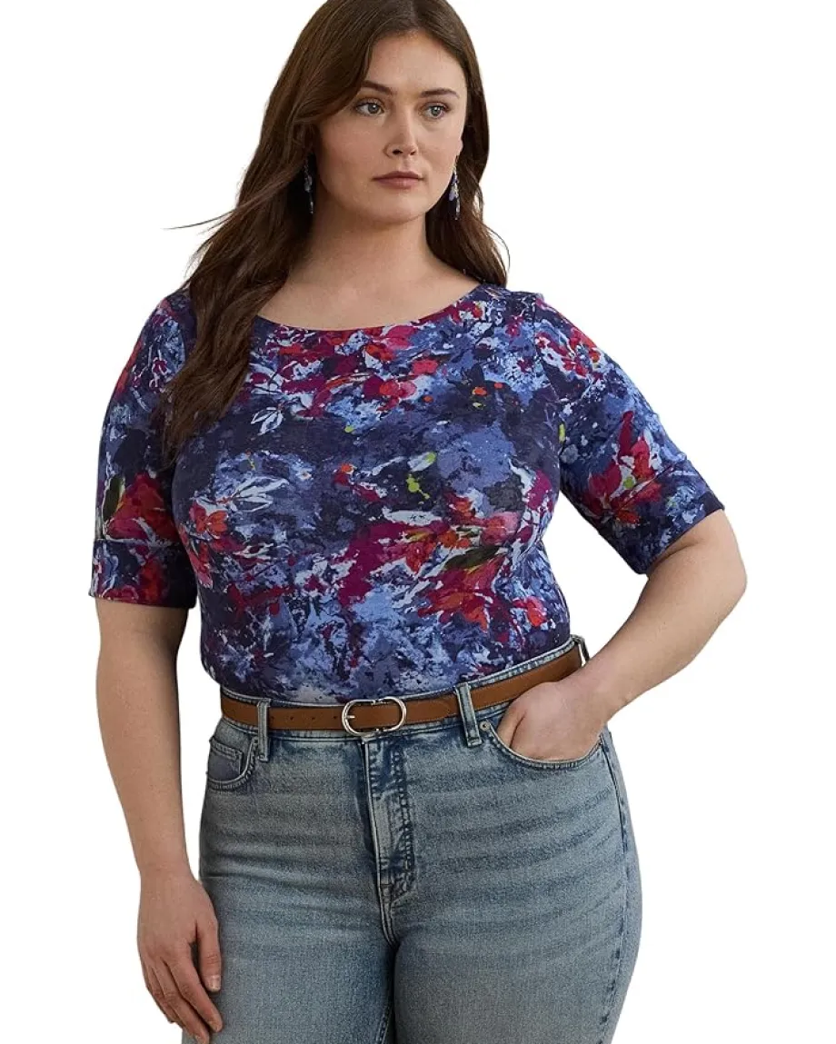 - Cut from stretch cotton for a soft hand feel, this LAUREN Ralph Lauren® Print Stretch Cotton Boatneck Tee melds Lauren’s iconic belting print with a travel-inspired motif. An “LRL”-embroidered logo at the hem adds a signature finish. The slim fit top features a boat neckline and elbow-length sleeves with folded angle cut cuffs.