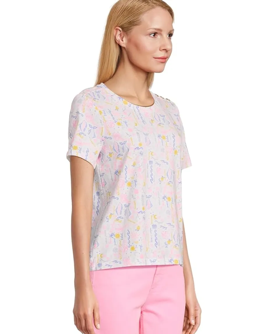 - The Lilly Pulitzer® Barreto Knit Top is a vibrant wardrobe staple with a playful twist. Featuring a straight fit, crew neckline, and short sleeves, this top stands out with its colorful printed details and stylish, branded buttons at the left shoulder. Perfect for pairing with your favorite shorts or skirts, it brings effortless charm to any casual look.