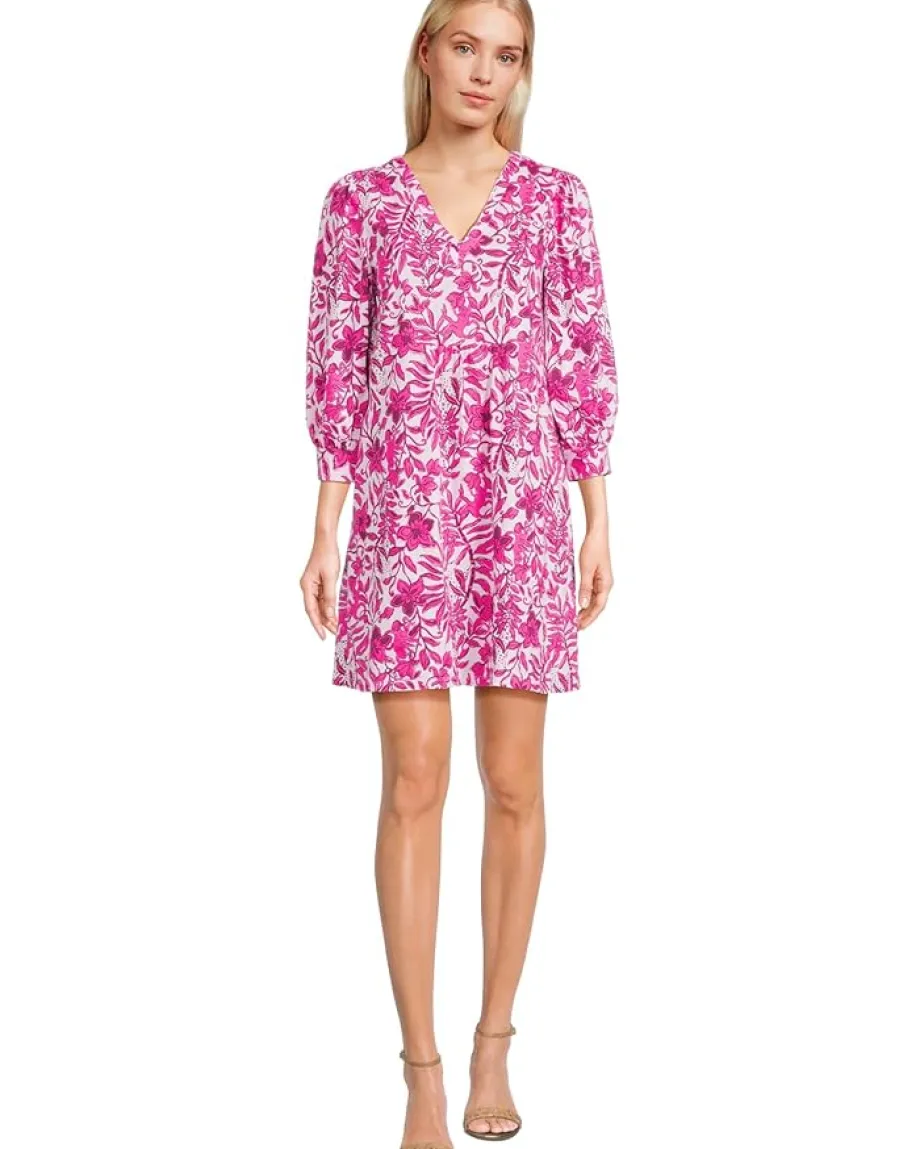 - Bloom into effortless elegance wearing the Lilly Pulitzer® Cass Dress! This above-the-knee floral masterpiece is designed for a breezy, stylish look with an easy fit that flatters every figure. Its chic V-neckline and front yoke detail add a touch of sophistication, while quarter blouson sleeves with cuffs offer a hint of playful charm. Perfect for quick style on-the-go, the pull-on design makes it as practical as it is stunning.