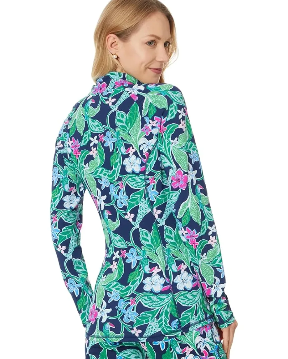 - Pair your sports shoes for outdoors by getting this modern Lilly Pulitzer® Justine Half Zip Upf 50+ top. The high collar spreads when open through half-front zip. The skinny-fit top has long sleeves and a shirttail hem. An allover floral print makes it outstanding. The top features shirring on the shoulder. Moisture-wicking construction keeps you dry throughout the day.
