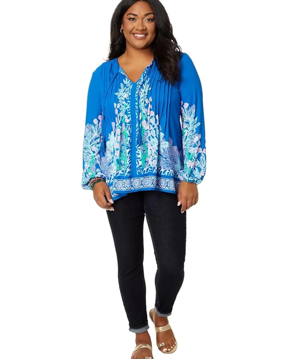 - Stay casual yet stylish wearing the Lilly Pulitzer® Marilina Long Sleeve Tuni top. The regular fit top has a notch neckline with a long tie closure, long sleeves, and a straight hemline. The intricate print all over adds a statement touch to the look.