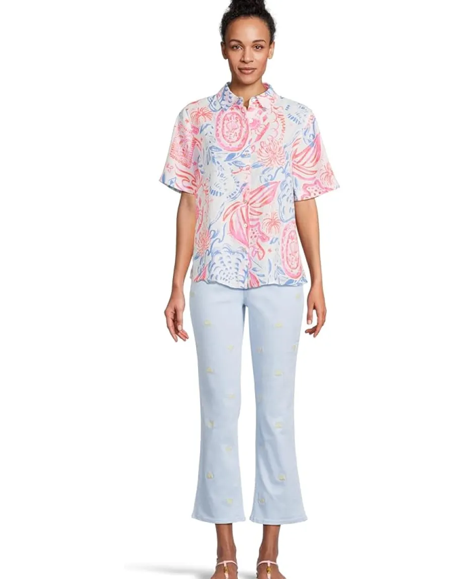 - The Lilly Pulitzer® Ridoc Top is a breezy, relaxed fit shirt crafted from linen for lightweight comfort and effortless style. Featuring short sleeves, a collared neckline, and a button-front closure, it offers a loose silhouette with an allover vibrant print pattern.