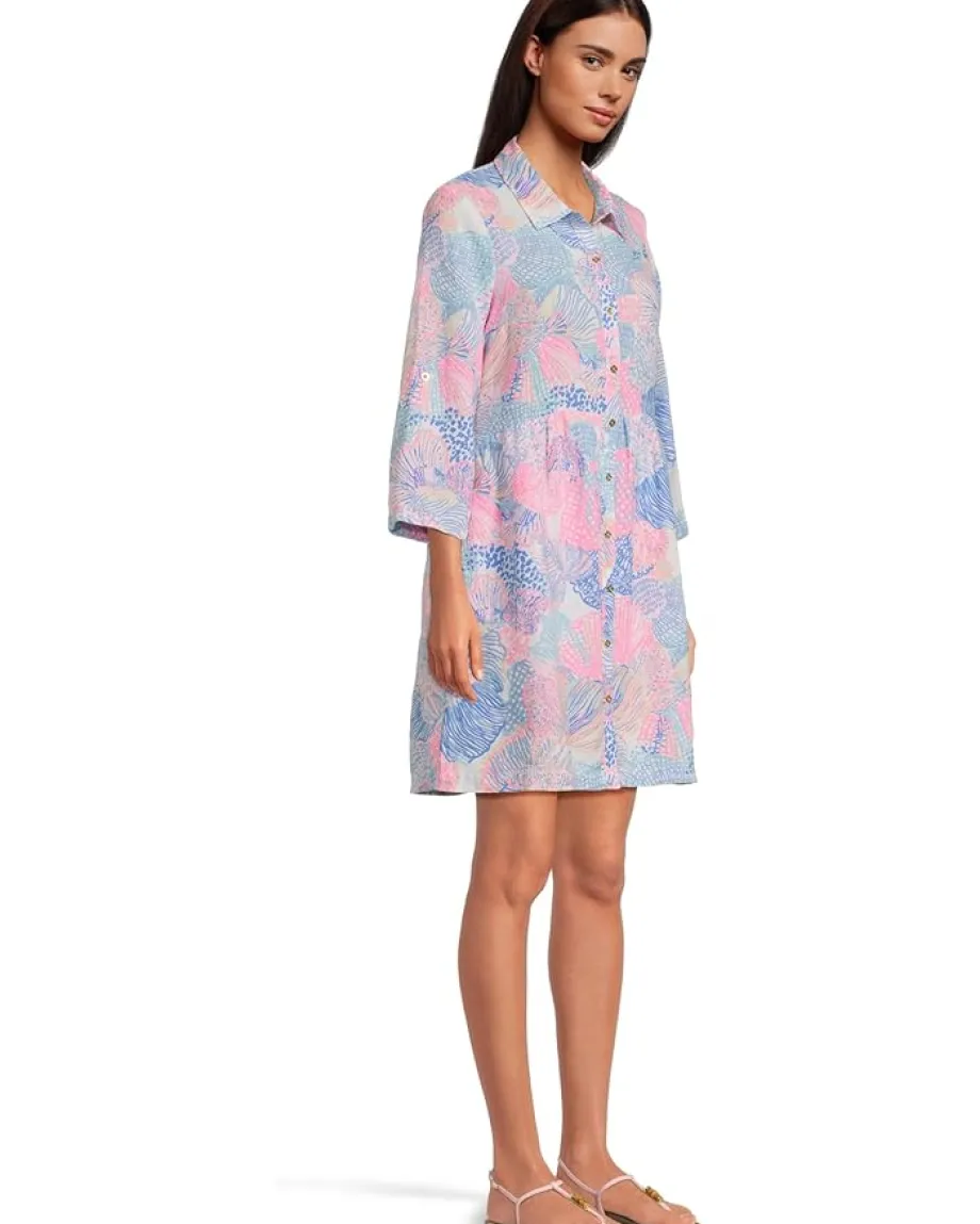 - The Lilly Pulitzer® Shaela Dress is an effortlessly chic piece designed for comfort and style. With an easy, roomier fit that gently skims the body, this above-the-knee dress features three-fourth sleeves with foldable cuffs and a classic collared neckline. The button-front closure adds a polished touch, while the vibrant floral print throughout bring a hint of elegance to this everyday favorite.