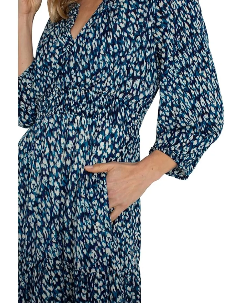 - Rev up the modern flair in your elegant look wearing Liverpoolâ„¢ Los Angeles 3/4 Sleeve Tiered Woven Maxi Dress. It features a split V-neckline, smocked waistline, long sleeves, and tiered skirt with ruffles fostering a flowy silhouette.