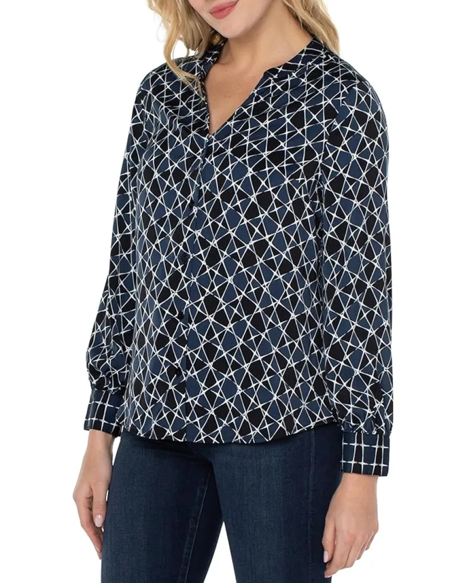 - Style your everyday look in the casual and vibrant Liverpoolâ„¢ Button Front Shirt with Banded Collar shirt, offering a comfortable year-round look. Designed with premium lightweight poly-sateen fabric in stargazing twin print. This button-up shirt features a banded collar and long sleeves with buttoned cuffs.