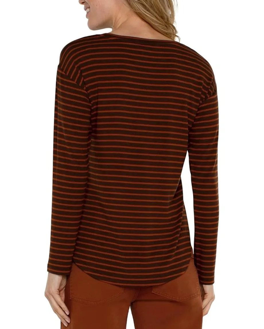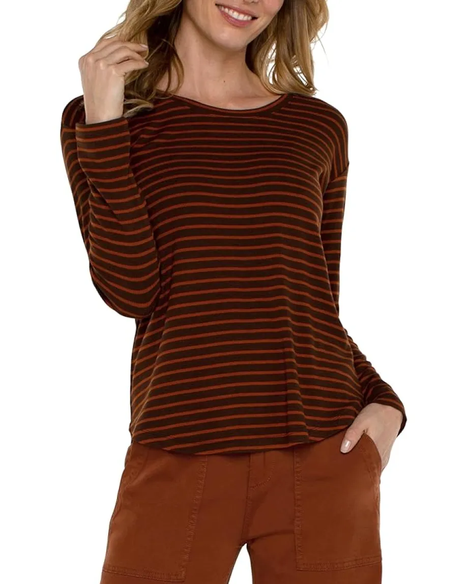- Bring a contemporary hint of timeless allure wearing the luxuriously soft Liverpoolâ„¢ Los Angeles Long Sleeve Drop Shoulder Scoop Neck Rib Knit Top. It features a scoop neckline and long sleeves with drop shoulder seams. The curved hem is dramatically shaped to complement your easy-breezy style.