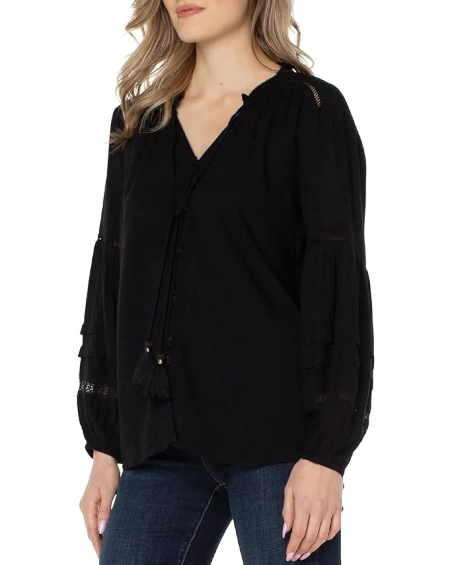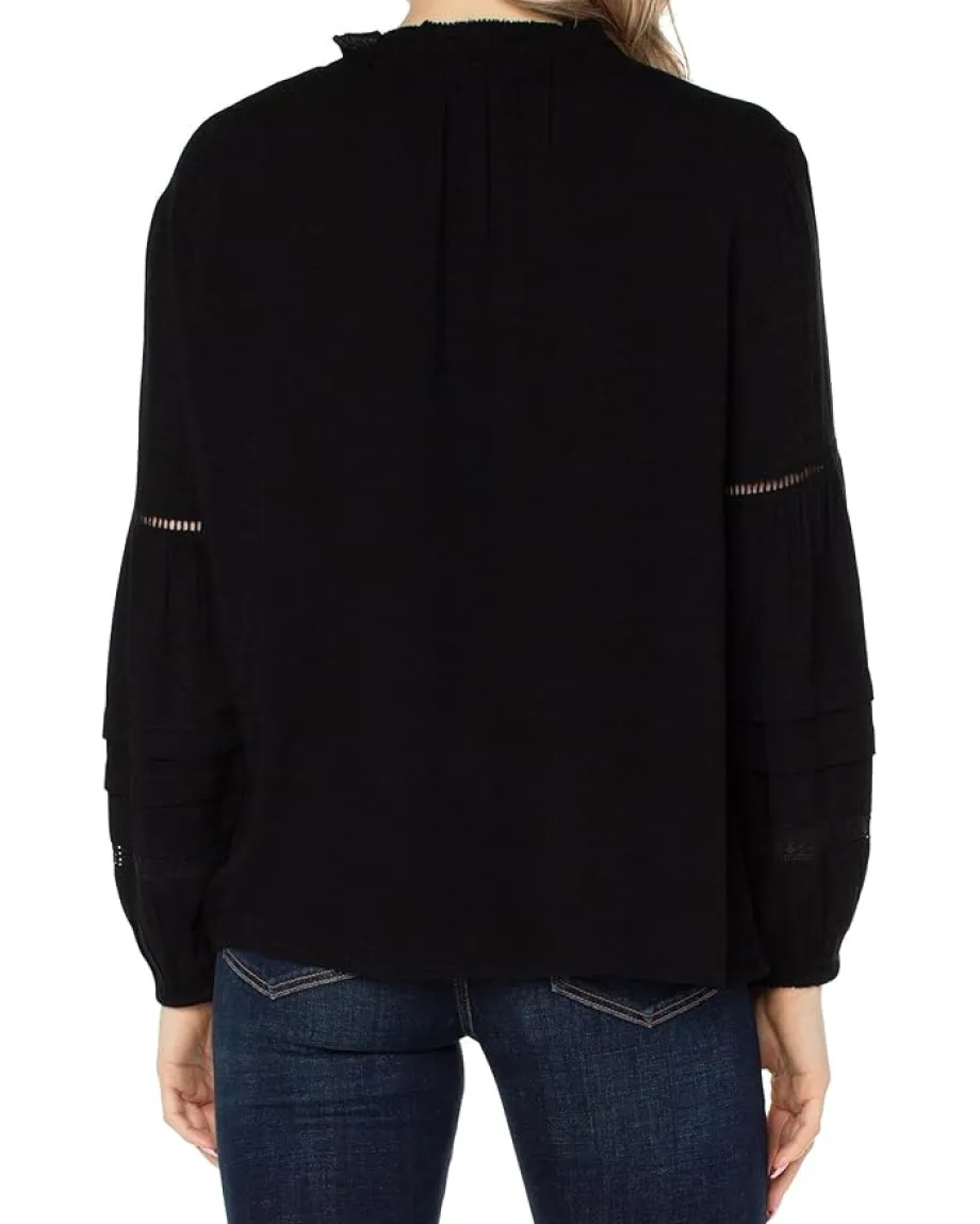 - Look lovely in the relaxed breezy style of this Liverpoolâ„¢ Long Sleeve Popover Shirred Blouse that is designed with a lightweight fabric to keep you comfortable all day long. This classic silhouette is accented with a shirred back panel and a flattering v-neckline with ruffled collar and self-tie detail for a timeless look.