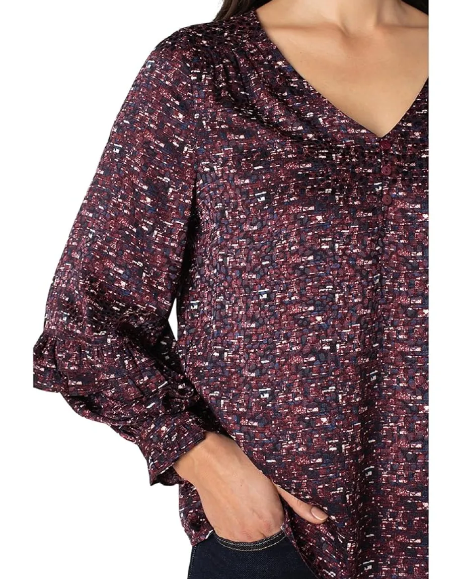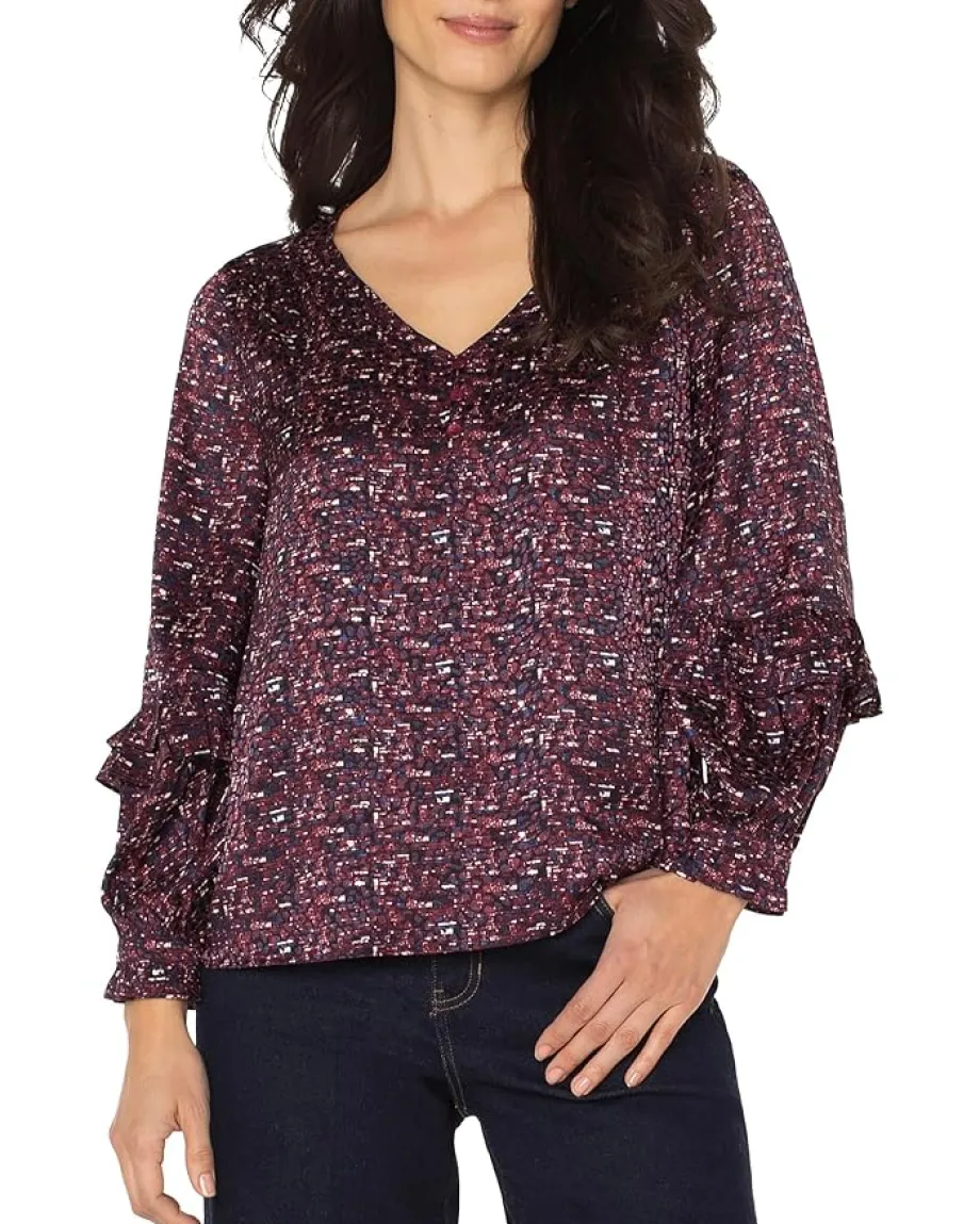 - The Liverpoolâ„¢ Los Angeles Long Sleeve Woven Blouse W/ Ruffles make a striking statement with its multi print pattern, elegant and designed to be uniquely yours. Designed with a V-neck, three front buttons, and subtle ruffles on the sleeves, it drapes effortlessly whether worn tucked, untucked, or layered under a jacket. Sleek enough for the office, bold enough for after hours.
