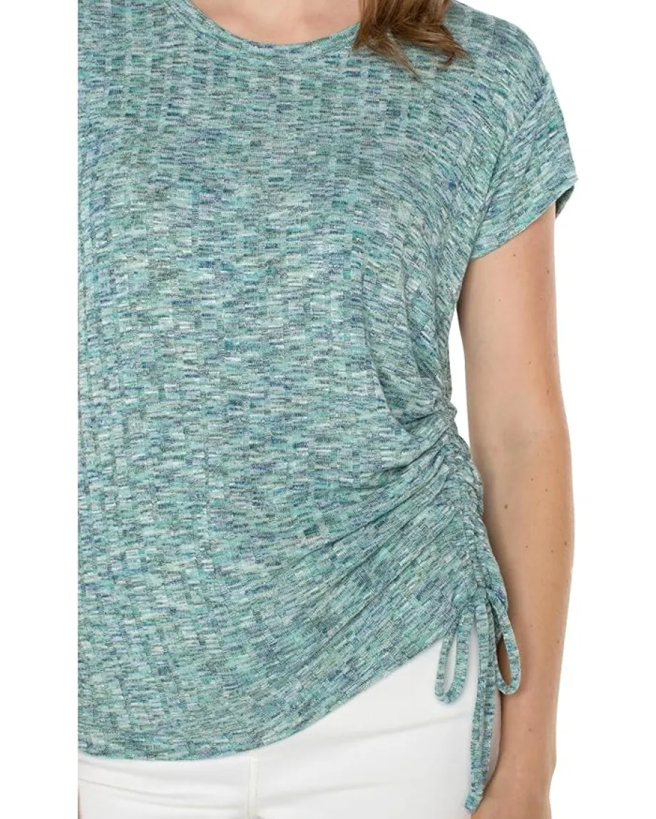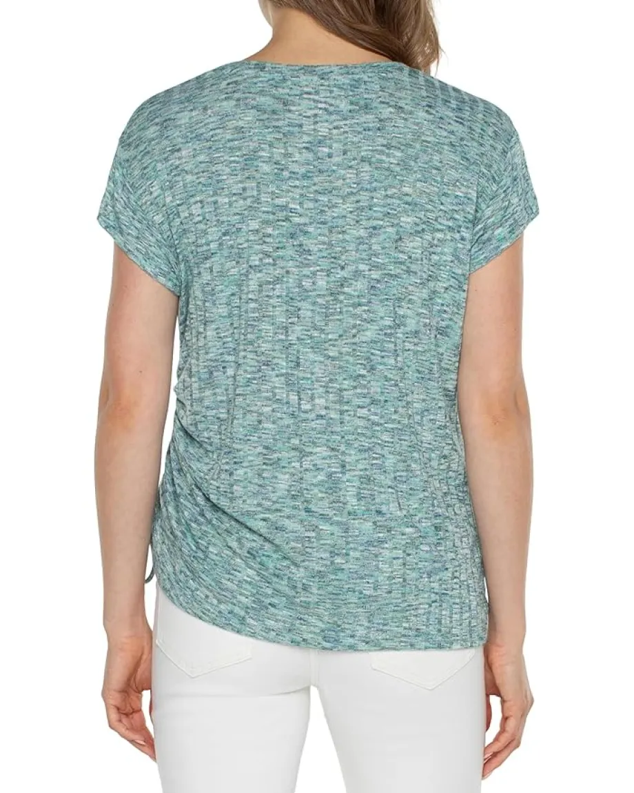 - Elevate your casual closet effortlessly wearing Liverpoolâ„¢ Los Angeles Short Sleeve Scoop Neck with Side Tie Detail Space Dye Rib Knit, featuring an attractive spacedyed print and side cinch-tie detail. Crafted with a premium spacedye rib knit fabric, the pull-on style top has a scoop neck and short sleeves.