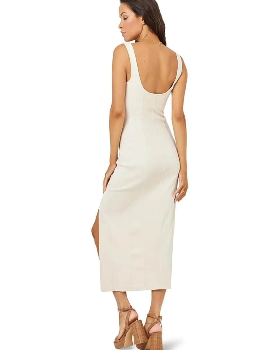 - Minimal yet alluring, the L*Space® Vivienne Dress beautifully defines your feminine flair while keeping your comfort game intact wherever you go. Tailored in a fitted, bodycon silhouette, this stretch-blend, solid-colored, ribbed dress displays a sleeveless design with a squared scoop neckline, thick shoulder straps, a deep U-back, and a daring leg slit on the side.