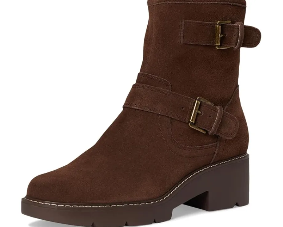 - A moto boot classic look in leather! The Lucky Brand® Migyn Double Buckle Moto Boots feature a double buckle detail, rubber outsole, leather upper, chunky block heel and zippered side closure.